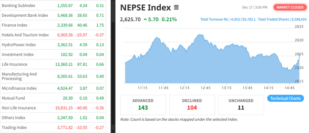 नेप्सेमा आज होटेल तथा पर्यटन‚ निर्जीवन बिमा र व्यापार समूहको सूचक घट्दा बाँकी १० वटै समूहका सूचक बढे। नेप्सेमा आज १४३ कम्पनीको मूल्य बढ्यो‚ १०४ वटाको घट्यो भने ११ को स्थिर रह्यो।