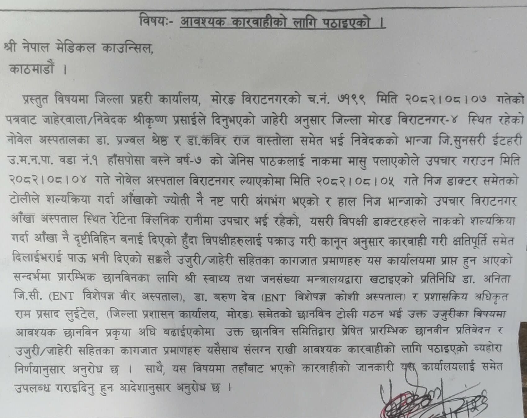 यता, जिल्ला प्रहरी कार्यालय मोरङले प्रतिवेदनका आधारमा आवश्यक कारबाही प्रक्रिया अगाडि बढाउन १ पुसमा नेपाल मेडिकल काउन्सिललाई पत्राचार गरिसकेको छ।