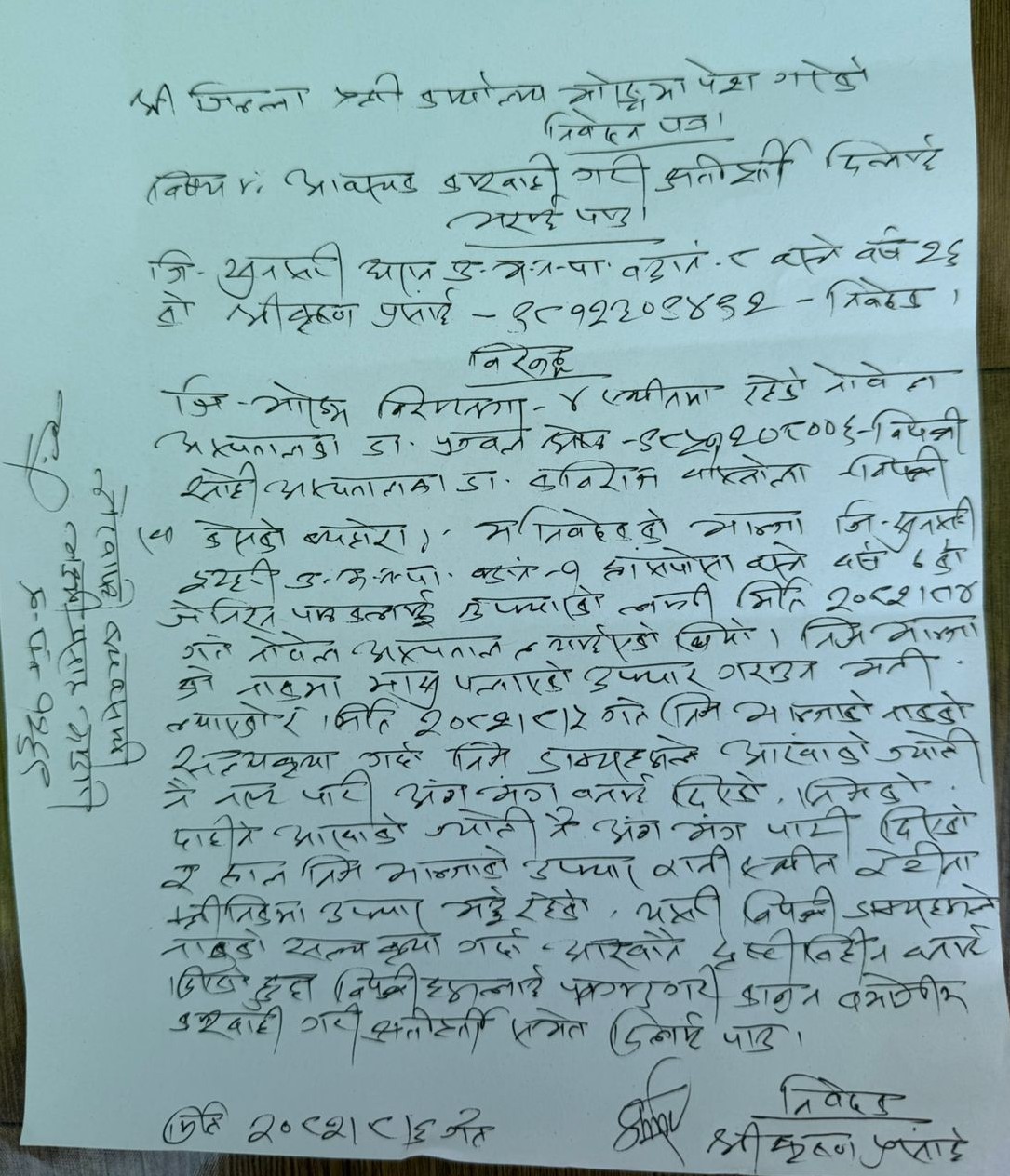 मोरङका सहायक प्रमुख जिल्ला अधिकारी सरोज कोइराला भन्छन्, “चिकित्सकसँग सम्बन्धित विषय नेपाल मेडिकल काउन्सिलले हेर्ने भएकाले हामीले निवेदकले दिएको जाहेरीसहितको सम्पूर्ण कागजपत्र र प्रतिवेदन काउन्सिललाई बुझाएका छौँ। अब आवश्यक कारबाही काउन्सिलले नै अघि बढाउनेछ।”