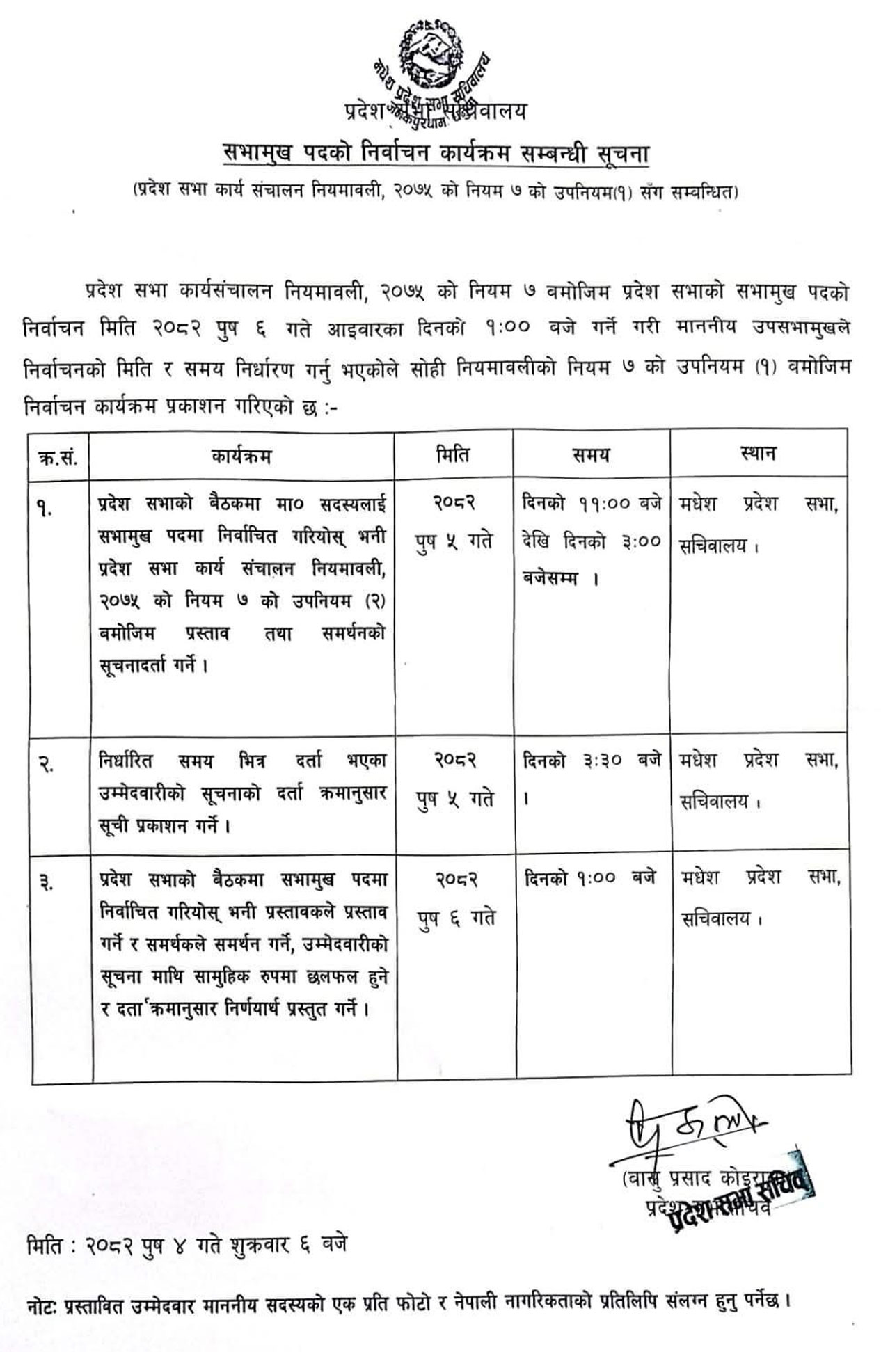 जनकपुर। मधेस प्रदेशको सभामुखको निर्वाचन तालिका सार्वजनिक भएको छ।