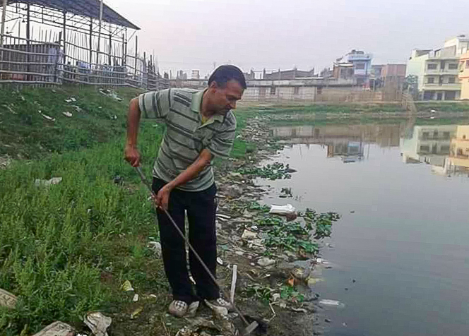 जनकपुरको गोरधोई पोखरीको सरसफाइ गरिरहेका यादव