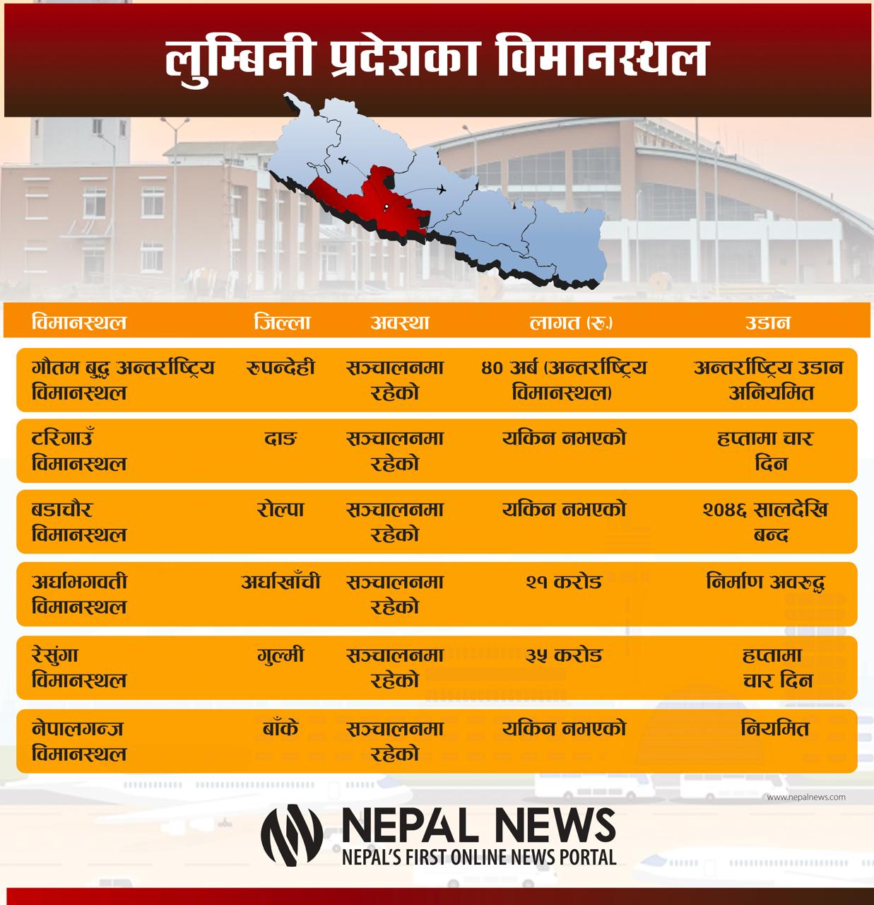 लुम्बिनी प्रदेशका १२ जिल्लामध्ये ६ वटामा विमानस्थल छन्। यीमध्ये एउटा बन्द र एउटाको निर्माण अवरुद्ध छ भने बाँकी चारमध्ये नेपालगन्ज विमानस्थल र गौतम बुद्ध विमानस्थलमा मात्रै नियमित उडान हुन्छ। लुम्बिनीका सबैजसो पहाडी जिल्लामा जनताको आवश्यकताभन्दा पनि नेताहरूको चुनावमुखी लहडका आधारमा विमानस्थल बनेका हुन्। विमानस्थल बने पनि जहाजहरू पर्याप्त नरहेको, यात्रु थोरै हुने, त्यसकै कारण नियमित उडान हुन नसक्ने, उडान गर्दै आएका वायुसेवा कम्पनीले सेवा बन्द गर्ने, विमानस्थलको दैनिक सञ्चालन खर्च धान्न नसक्नेजस्ता अवस्थाले विमानस्थल निर्माणमा राज्यले गरेको अर्बौं रुपैयाँ लगानी धरापमा परेको देखाउँछन्। खासगरी पछिल्लो समय पहाडी जिल्लाहरूमा समेत सडक सञ्जाल विस्तार भइसकेको छ। योसँगै सडक यातायातभन्दा हवाई यात्रा महँगो हुने भएकाले विमानहरूले आवश्यक यात्रु पाउने गरेका छैनन्। जसका कारण दाङको टरिगाउँ विमानस्थल, गुल्मीको रेसुंगा विमानस्थलबाट नियमित उडान हुने गरेको छैन। ४० अर्ब रुपैयाँ लागतमा बनेको गौतम बुद्ध अन्तर्राष्ट्रिय विमानस्थलबाट नियमित अन्तर्राष्ट्रिय उडान नै हुँदैन।