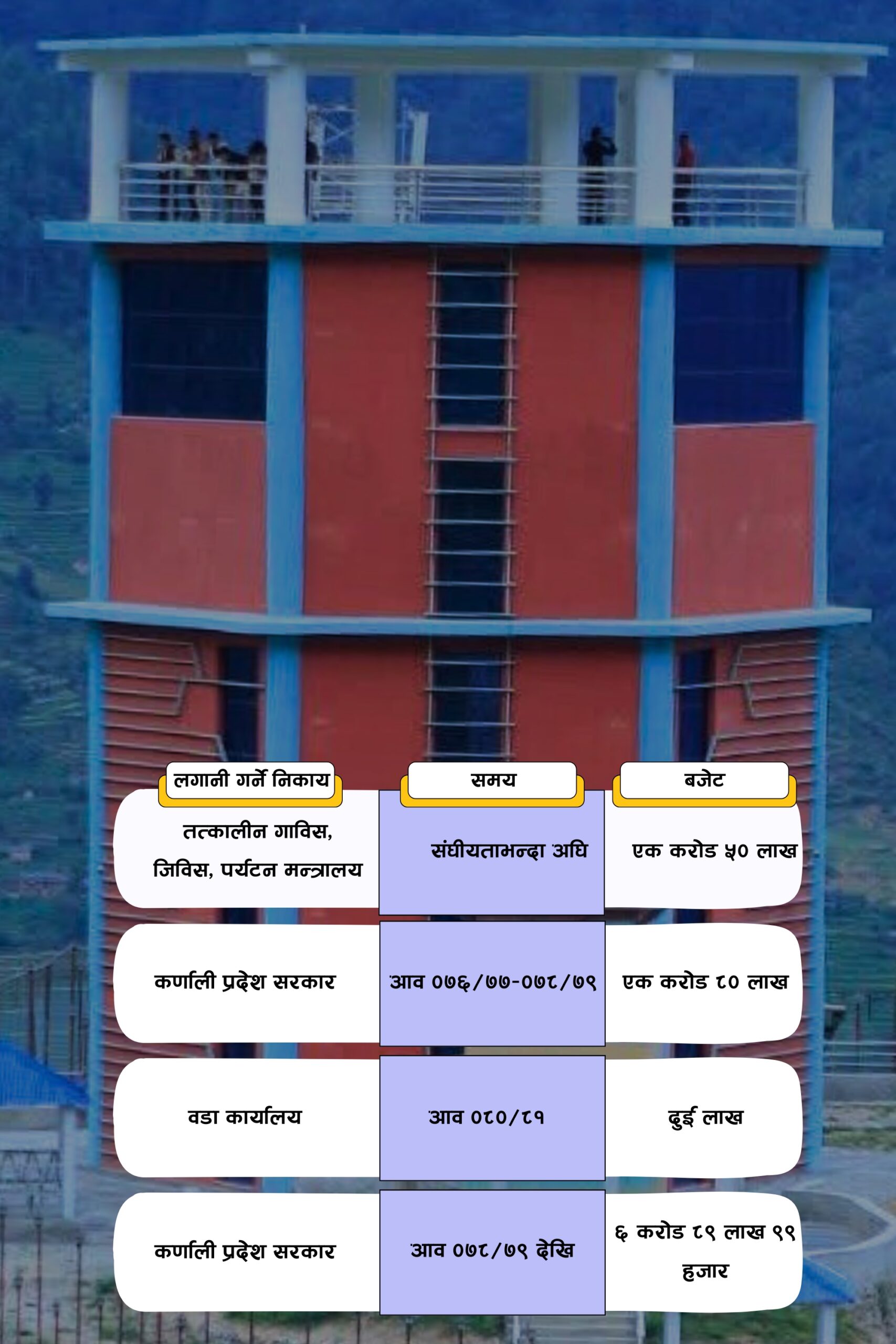 यस्तै, स्थानीय महेन्द्र भारती पनि अत्यावश्यक पूर्वाधारमा लगानी गर्नु साटो प्रदेश सरकारले अनावश्यक पूर्वाधार बनाउन खर्च गरेको बताउँछन्। उनी भन्छन्, “मेरो ठाउँमा पर्यटकीय स्थल अनुचित होइन। तर, जनताका लागि लगानी गर्नुपर्ने अरू थुप्रै क्षेत्र हुँदाहुँदै अग्ला डाँडामाथि भ्युटावरका नाममा गरिने लगानीमा मेरो असहमति नै छ।”