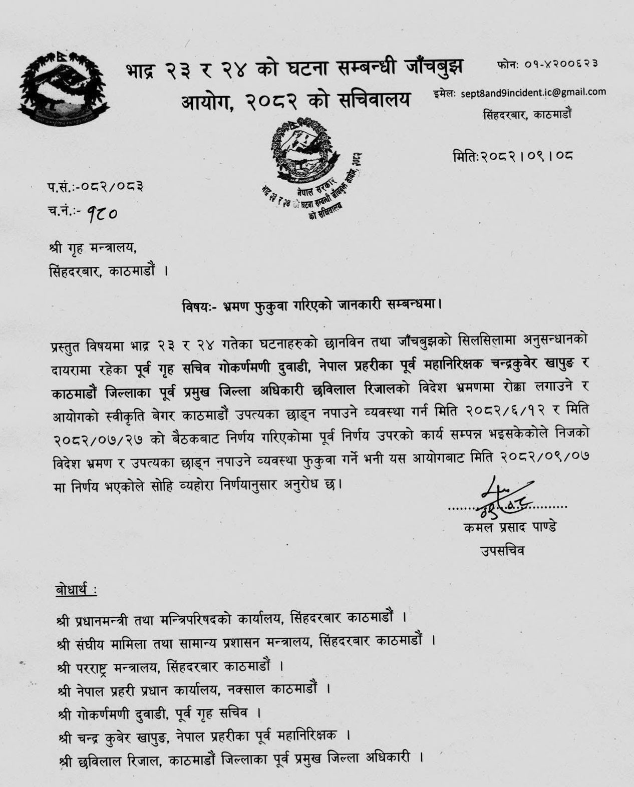 उनीहरूमाथि आयोगले विदेश भ्रमण र काठमाडौँ उपत्यका छाड्न रोक लगाएको थियो। तर, मंगलबार आयोगले गृह मन्त्रालयलाई पठाएको उपसचिव कमलप्रसाद पाण्डेले हस्ताक्षर गरेको पत्रमा भनिएको छ, “पूर्वनिर्णयउपरको कार्यसम्पन्न भइसकेकाले निजको विदेश भ्रमण र उपत्यका छाड्न नपाउने व्यवस्था फुकुवा गर्ने निर्णयअनुसार अनुरोध छ।’