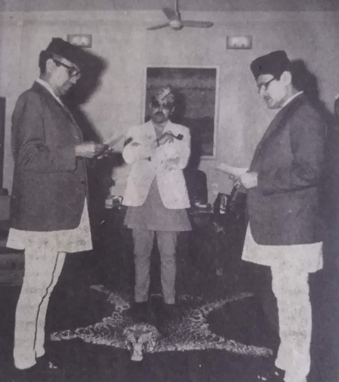राजा वीरेन्द्रको अगाडि जोगमेहर श्रेष्ठ (बायाँ)लाई मन्त्री पदको शपथ खुवाउँदै प्रधानमन्त्री तुलसी गिरी