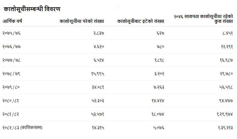 गत आर्थिक वर्ष २०८१/८२ मा मात्रै ५३ हजार ५७१ व्यक्ति तथा संस्था कालोसूचीमा परेका थिए। उक्त वर्ष कालोसूचीमा पर्नेको संख्या अघिल्लो वर्षभन्दा शतप्रतिशतभन्दा धेरै बढेको थियो। त्यसअघि २०८०/८१ मा एकै वर्ष ५२ हजार ३०३ व्यक्ति र संस्था कालोसूचीमा राखिएका थिए। २०८० को साउनयता गत कात्तिकसम्म मात्रै एक लाख २० हजार १८९ व्यक्ति तथा संस्था कालोसूचीमा पर्दा सूचीबाट हट्नेको संख्या भने ३७ हजार ५७४ मात्रै छ।