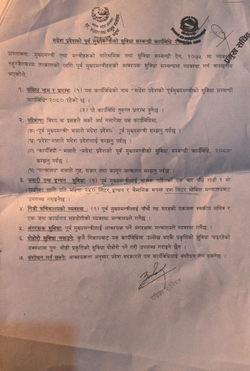 मधेस प्रदेशमा पूर्वमुख्यमन्त्रीलाई सवारी तथा इन्धन सुविधा, निजी सचिवालय र अंगरक्षकको व्यवस्था