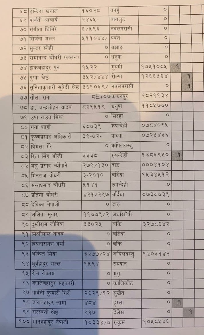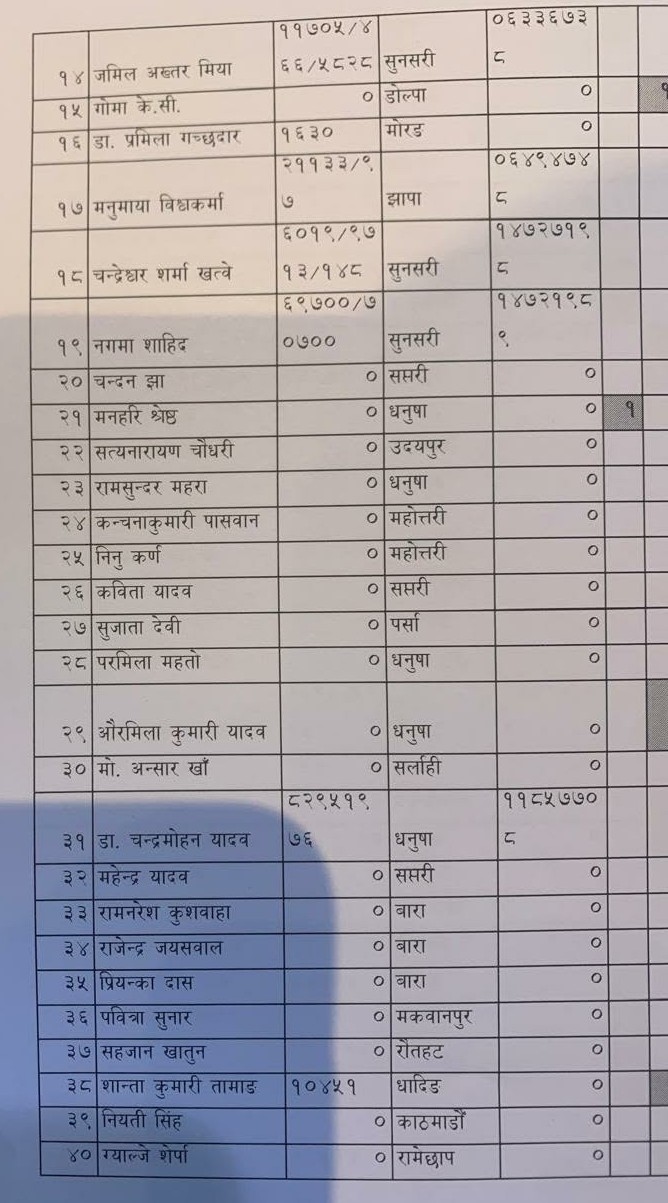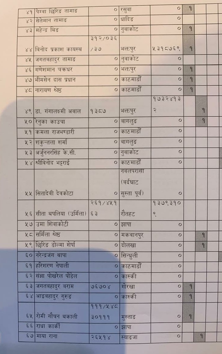 यस्तै केन्द्रीय सदस्य बलबहादुर केसीकी पत्नी रिना उप्रेती‚ नेपाल तरुण दलका पूर्वअध्यक्ष विनोदप्रकाश कायस्थको नाम पनि समावेश छ।