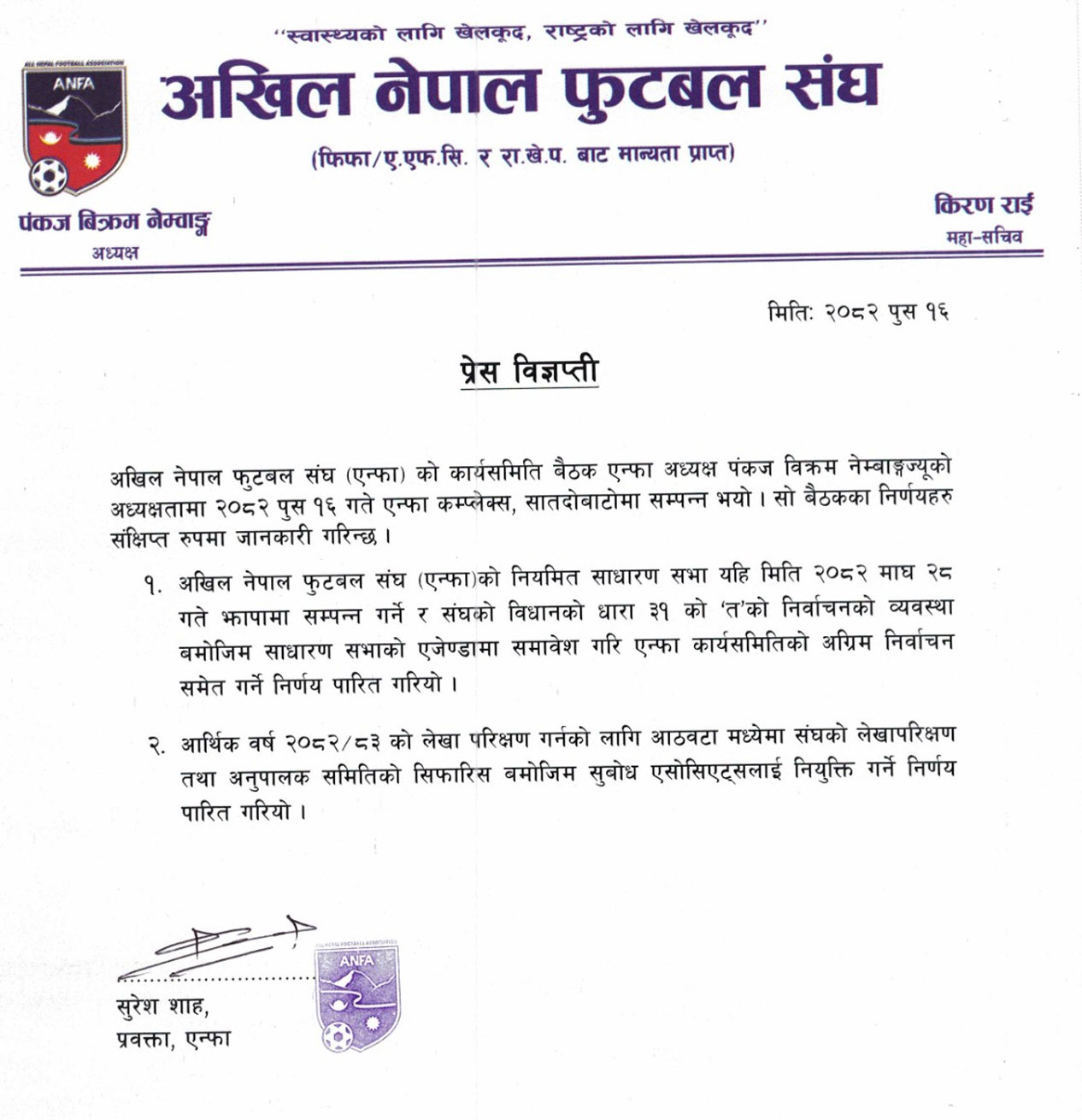 सातदोबाटोस्थित एन्फा कम्प्लेक्समा बुधबार बसेको कार्यसमिति बैठकले आगामी २८ माघमा निर्वाचनमा निर्वाचन गर्ने निर्णय भएको हो। एन्फाका प्रवक्ता सुरेश शाहका अनुसार बहुमत सदस्यले यस्तो निर्णय गरेका हुन्। “बहुमत सदस्यले चारवर्षे कार्यकाल सकिनुअगावै निर्वाचनमा जाने प्रस्ताव राख्नुभयो। उक्त प्रस्ताव पारित गरेका छौं,” शाहले नेपालन्युजसँग भने।