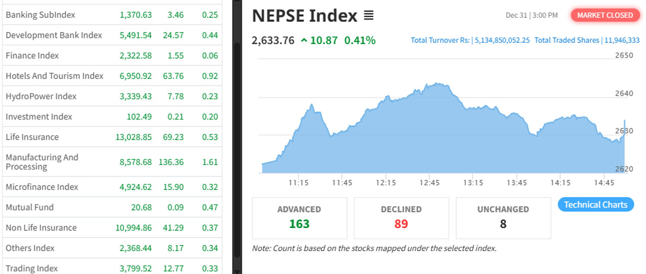 काठमाडौँ। नेपाल स्टक एक्सचेन्ज (नेप्से) आज (बुधबार) १०.८९ अंकले बढेर २‚६३३.७८ विन्दुमा अडिएको छ। अघिल्लो दिनको तुलनामा आज नेप्से ०.४१ प्रतिशतले बढेको हो।