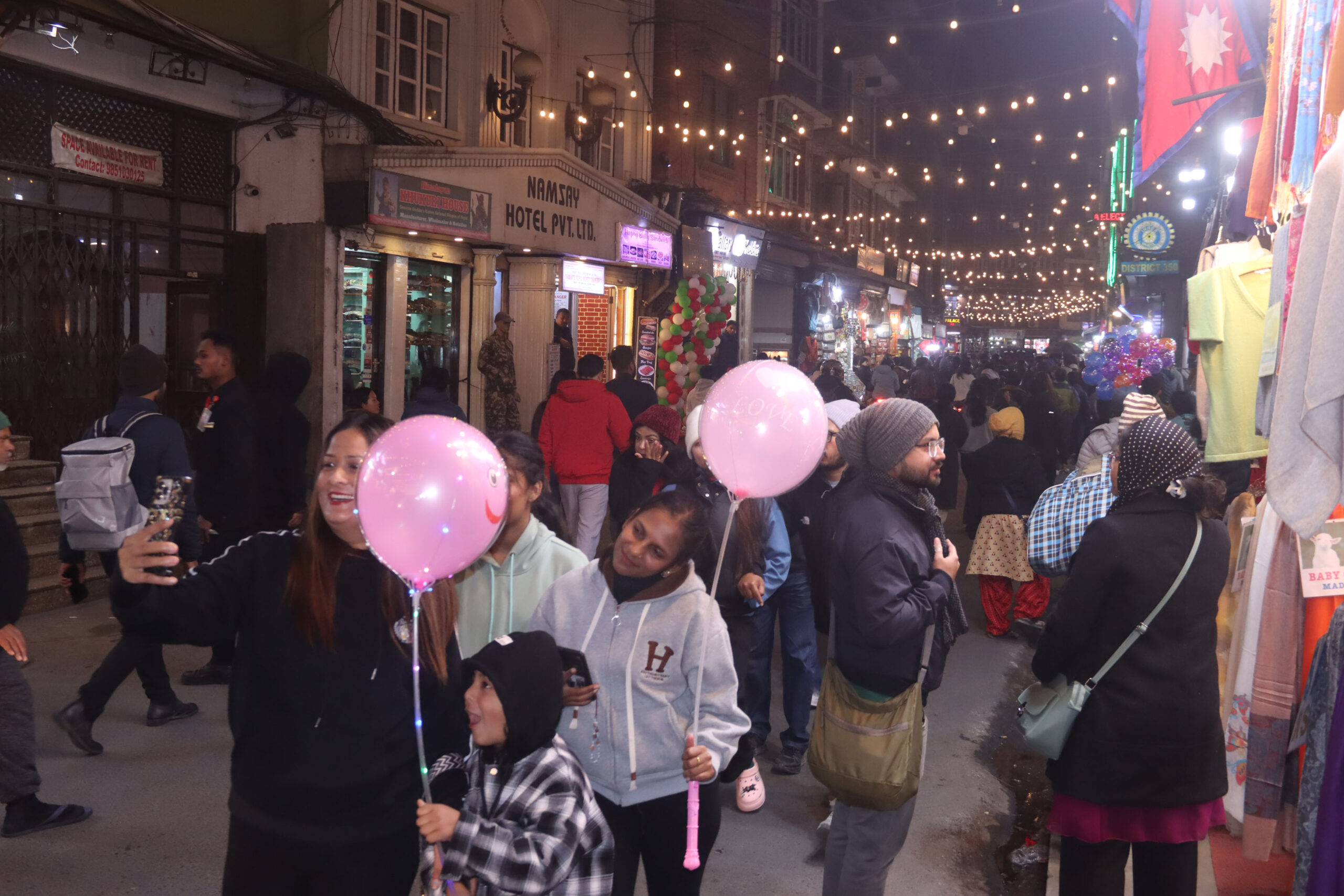 काठमाडौँ। अङ्ग्रेजी नयाँ वर्ष २०२६ को पूर्वसन्ध्यामा बुधबार साँझ काठमाडौँको ठमेलमा नयाँ वर्ष मनाउन आएका आन्तरिक पर्यटकहरुको चहलपहल देखिएको छ।
