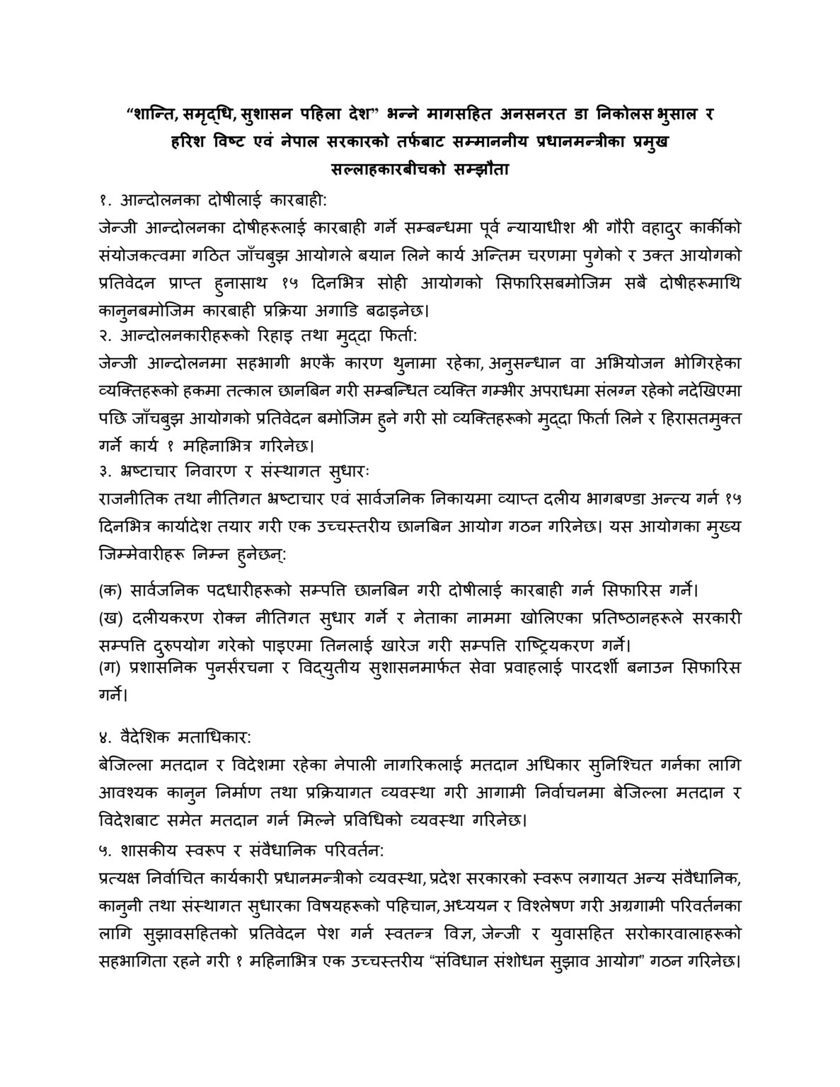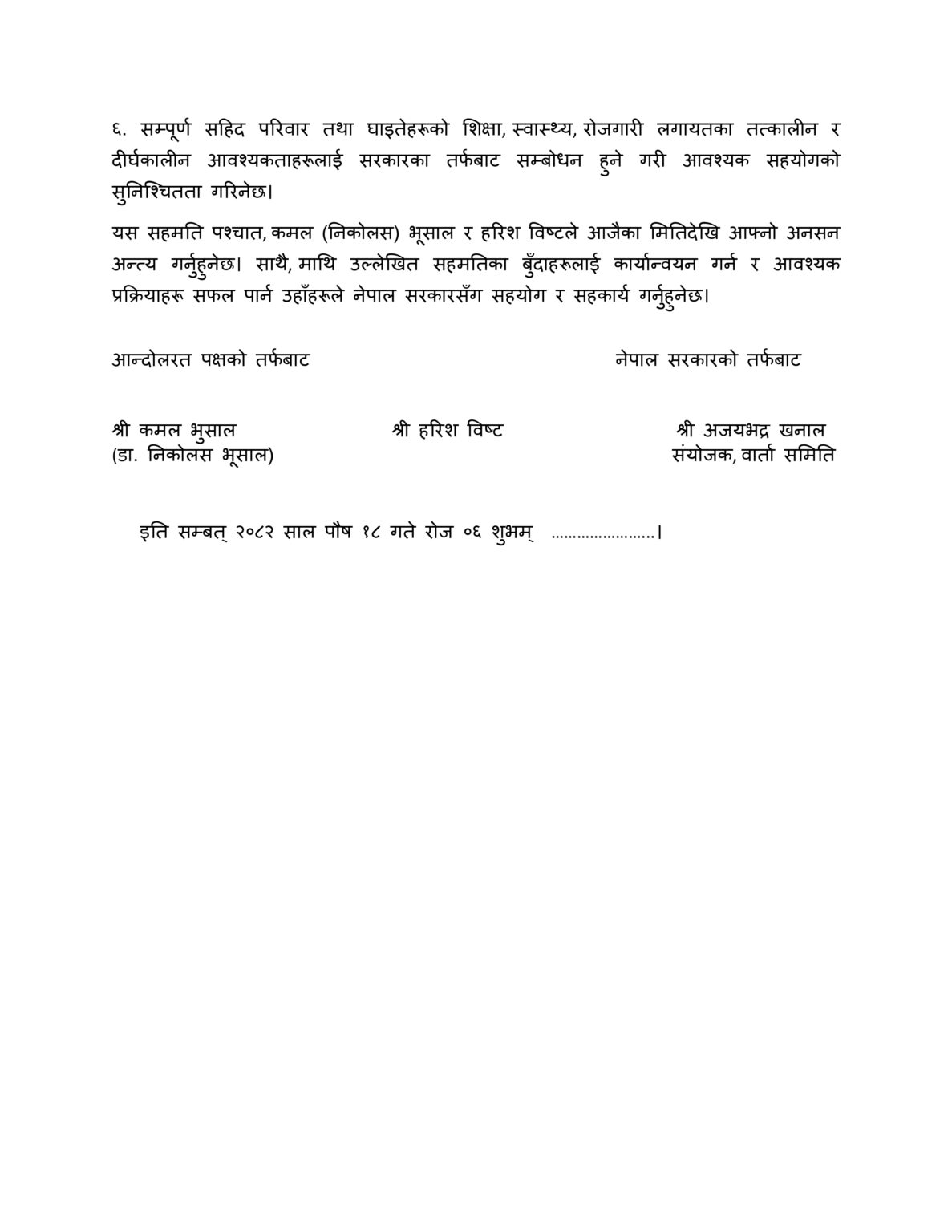 काठमाडौं। डा. निकोलस भुसाल र हरिश विष्टसँग सरकारबीच ६ बुँदे सम्झौता भएपछि ११औँ दिनमा अनशन तोडिएको छ। प्रधानमन्त्री सुशीला कार्कीले शुक्रबार बालुवाटारमा दुवै जनालाई जुस खुवाएर अनसन अन्त्य गराएकी हुन् ।