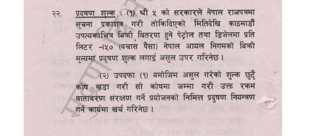 आर्थिक ऐन २०५३ मा काठमाडौँ उपत्यकाभित्र बिक्री वितरण हुने पेट्रोल तथा डिजेलमा प्रतिलिटर ५० पैसाका दरले नेपाल आयल निगमको बिक्री मूल्यमा प्रदूषण नियन्त्रण शुल्क लगाई असूलउपर गरिने र सोको छुट्टै कोष खडा गरी जम्मा गरी वातावरण संरक्षणका निमित्त प्रदूषण नियन्त्रणमा खर्च गर्ने उल्लेख गरिएको थियो। तर, यो कार्यान्वयनमा नआएपछि आर्थिक ऐन २०६४ मा सोही प्रावधान समेटियो।