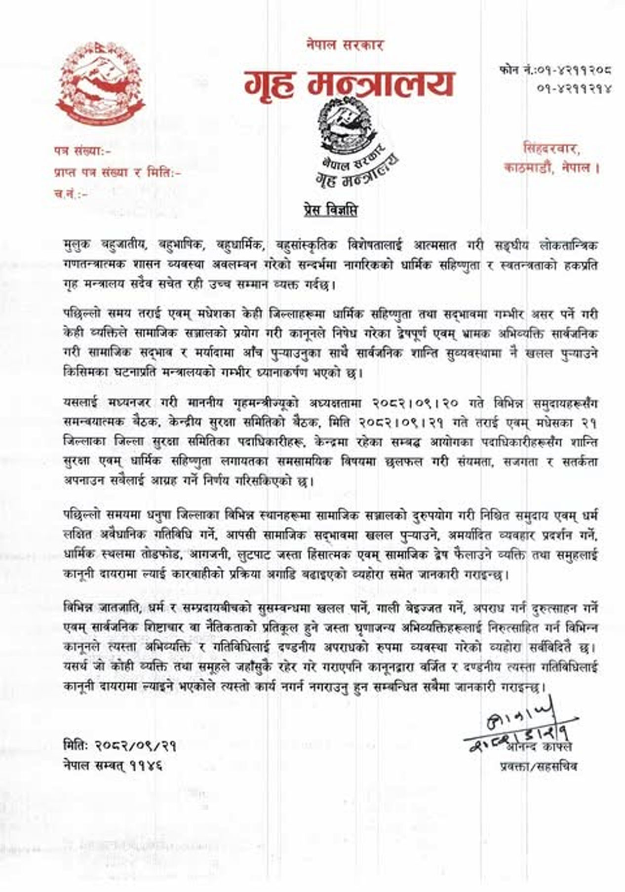 काठमाडौँ। सामाजिक सद्भाव र मर्यादामा आँच पुर्याउने जो-कोहीलाई कारबाही गर्ने गृह मन्त्रालयले चेतावनी दिएको छ।