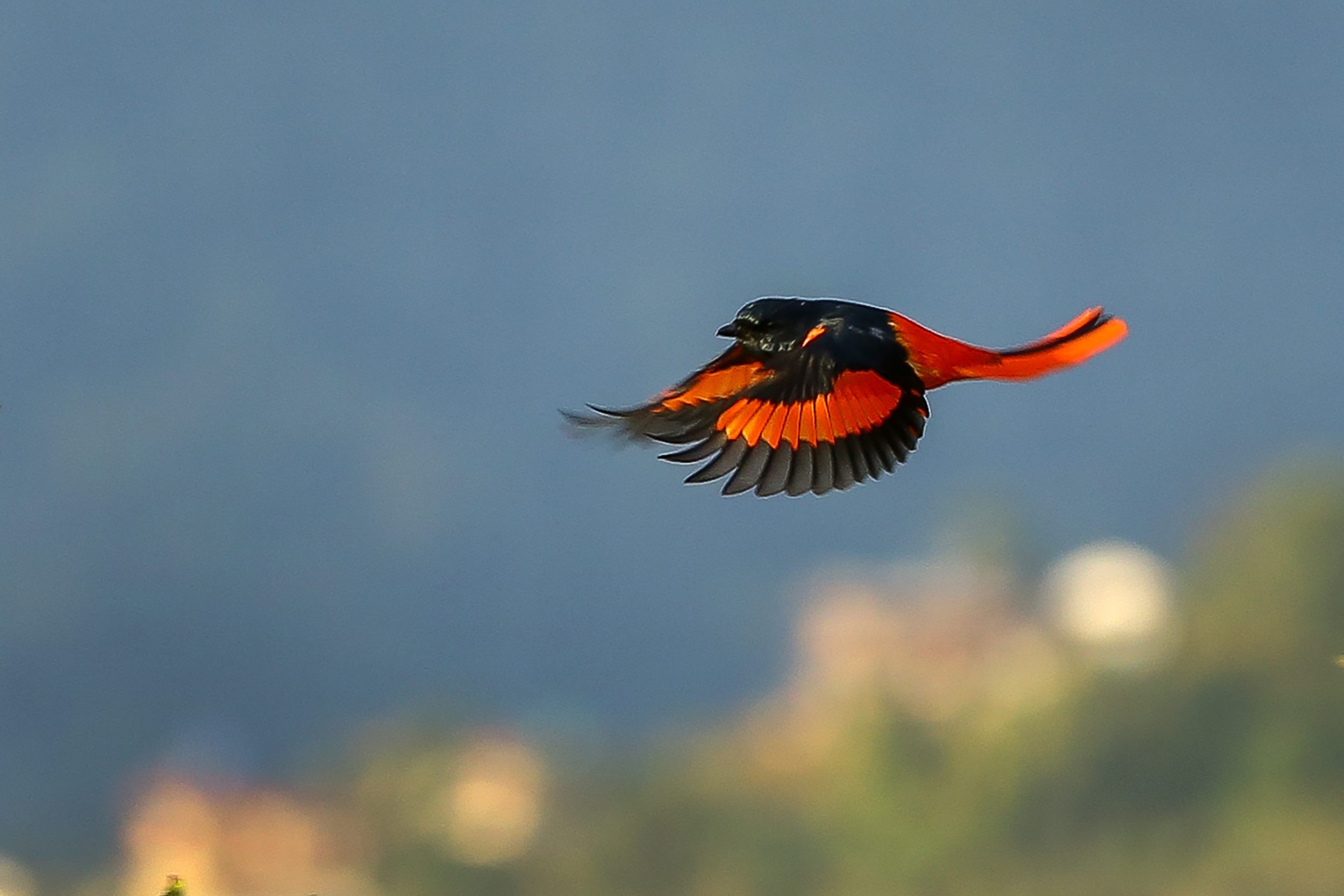 पोखरा। पोखराको स्तूप आसपासमा लामपुच्छ्रे रानीचरी (Long tailed minivet) देखिएको छ।