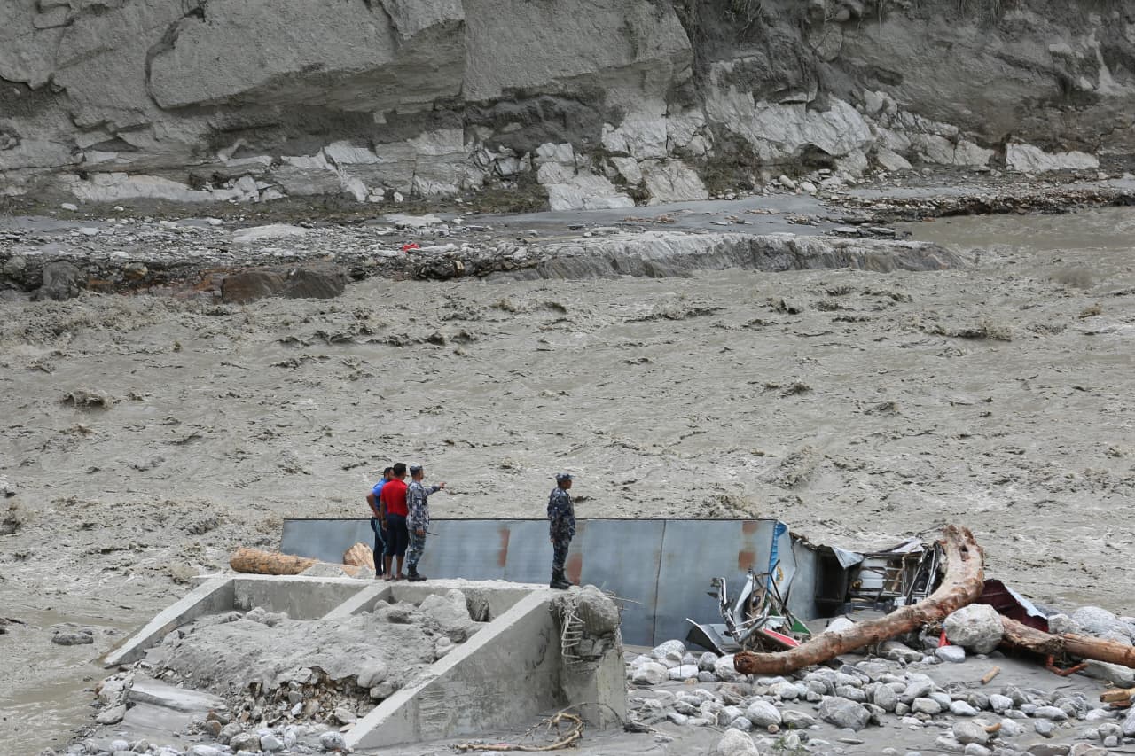 रसुवाको भोटेकोसीमा आएको बाढीपछिको क्षति अवलोकन गरिरहेका सुरक्षाकर्मी। तस्बिर : नेपाल फोटो लाइब्रेरी