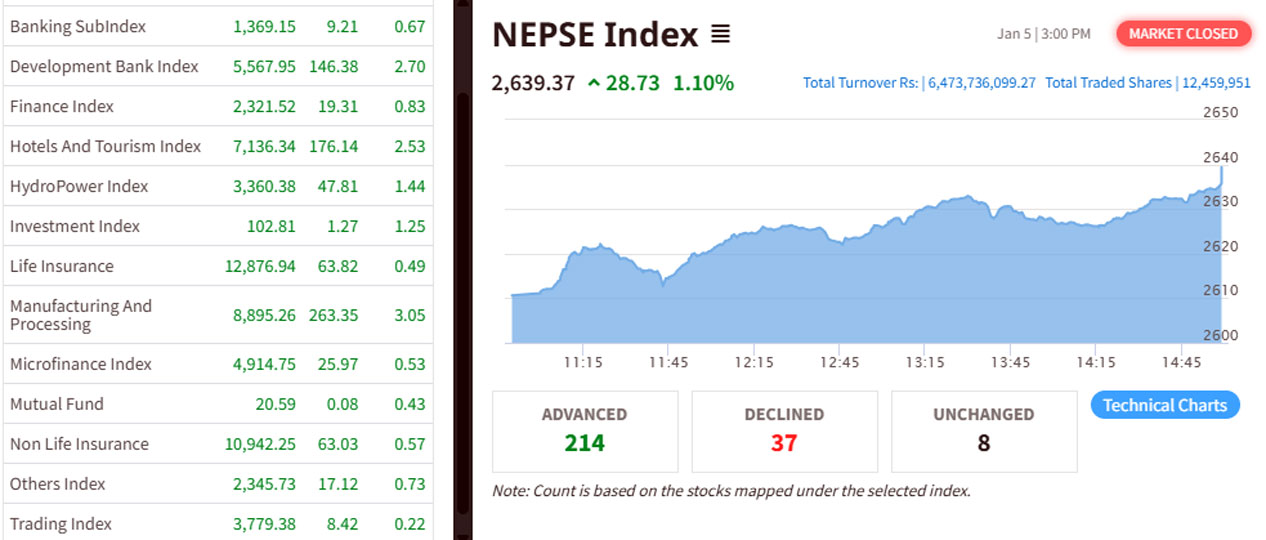 नेप्सेमा आज १३ वटै समूहका सूचकमा हरियाली देखिए। जसअनुसार वाणिज्य बैंक समूहको ०.६७ प्रतिशत‚ विकास बैंक २.७०‚ फाइनान्स ०.८३‚ आज होटेल तथा पर्यटन २.५३‚ जलविद्युत् १.४४, लगानी १.२५‚ जीवन बिमा ०.४९, उत्पादन तथा प्रशोधन ३.०५‚ लघुवित्त ०.५३‚ म्युचुअल फन्ड ०.४३‚ निर्जीवन बिमा ०.५७‚ अन्य समूह ०.७३ प्रतिशत र व्यापार समूह ०.२२ अंकले बढे। नेप्सेमा सोमबार २१४ कम्पनीको मूल्य बढ्दा ३७ वटाको मात्र घट्यो। आठ कम्पनीका सेयरमूल्य भने स्थिर रहे।