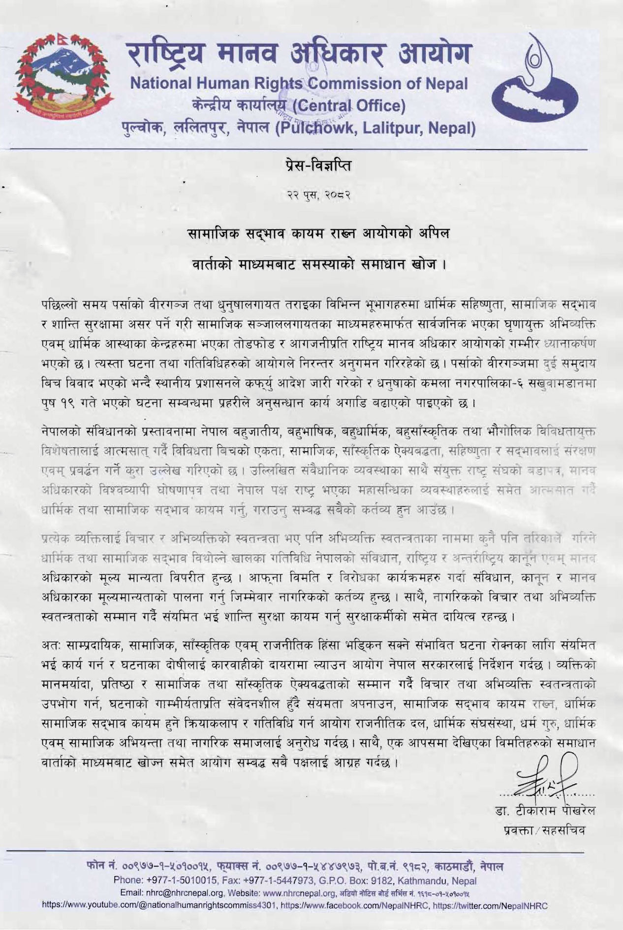 “व्यक्तिको मानमर्यादा, प्रतिष्ठा र सामाजिक तथा सांस्कृतिक ऐक्यबद्धताको सम्मान गर्दै विचार तथा अभिव्यक्ति स्वतन्त्रताको उपभोग गर्न, घटनाको गाम्भीर्यताप्रति संवेदनशील हुँदै संयमता अपनाउन, सामाजिक सद्भाव कायम राख्न, धार्मिक सामाजिक सद्भाव कायम हुने क्रियाकलाप र गतिविधि गर्न आयोग राजनीतिक दल, धार्मिक सङ्घसंस्था, धर्म गुरु, धार्मिक एवं सामाजिक अभियन्ता तथा नागरिक समाजलाई अनुरोध गर्दछ‚” विज्ञप्तिमा भनिएको छ, “साथै एकापसमा देखिएका विमतिहरूको समाधान वार्ताको माध्यमबाट खोज्नसमेत आयोग सम्बद्ध सबै पक्षलाई आग्रह गर्दछ।”