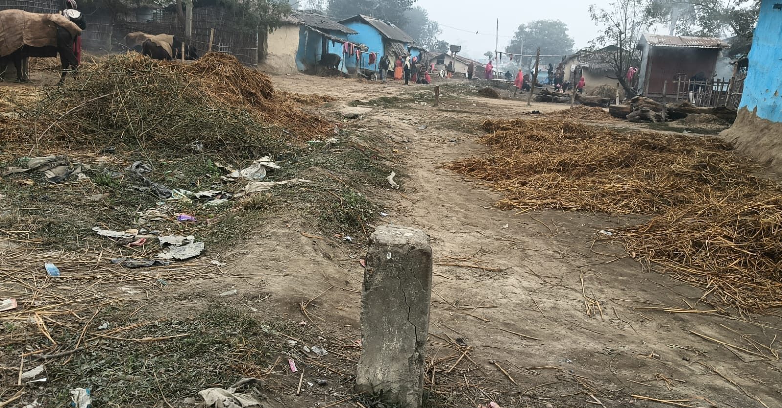 नेपाल-भारत सीमा स्तम्भ र पृष्ठभूमिमा मुसहर बस्ती
