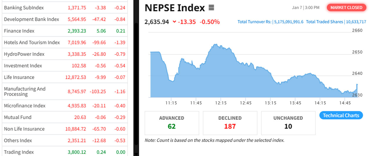 काठमाडौँ। साताको चौथो कारोबार दिन आज (बुधबार) सेयरबजार १३.३५ अंकले घटेको छ। अघिल्लो दिनको तुलनामा ०.५० प्रतिशतले घटेको नेप्से २‚६३५.९४ विन्दुमा रोकिएको छ।