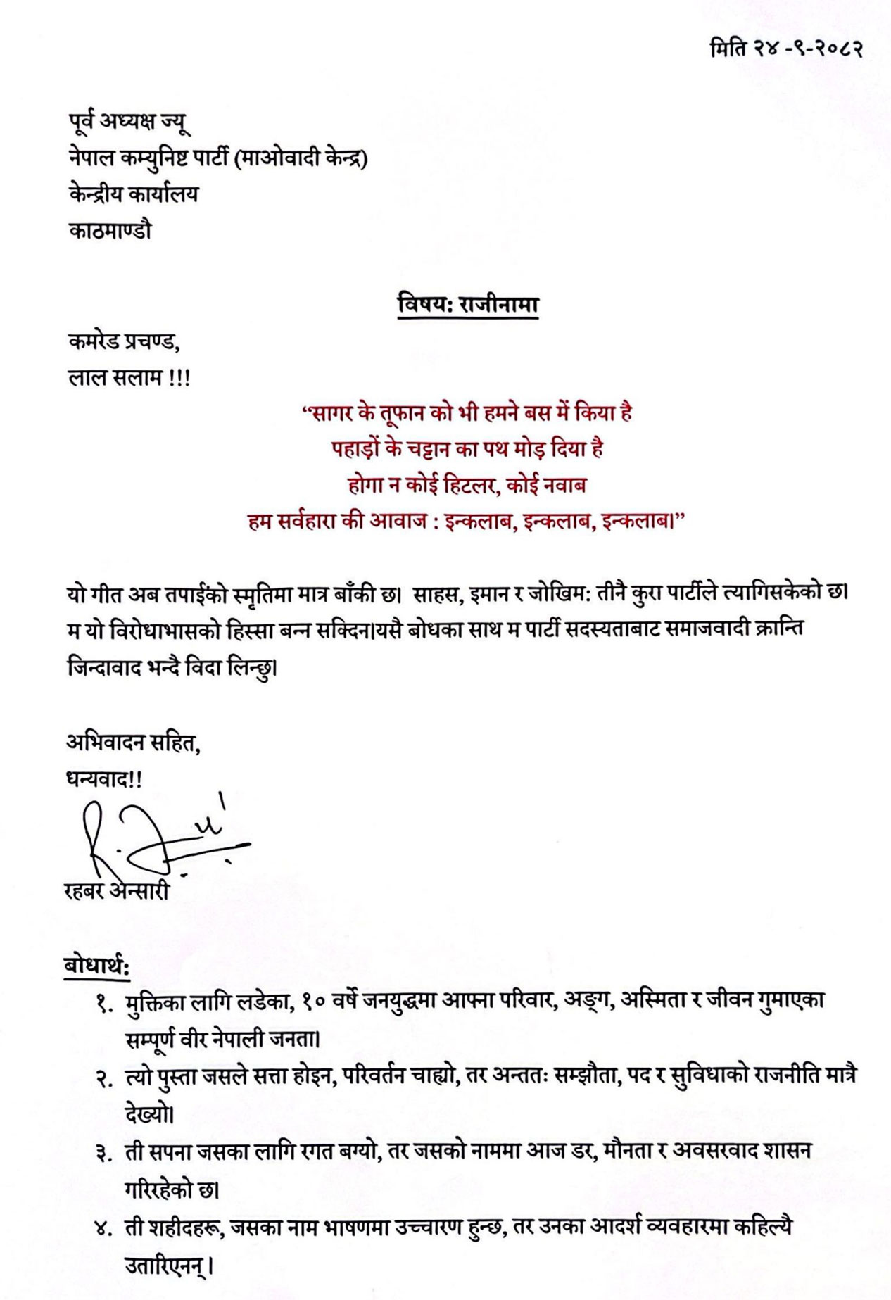 पार्टी त्याग गरिएको पत्रमा उनले सुरुआतमै चारलाइनको रातो अक्षरले कवितासमेत लेखेका छन्। रहबरले पत्रको बोधार्थ भने जनयुद्धका सहिद परिवार लगायतलाई दिएका छन्।