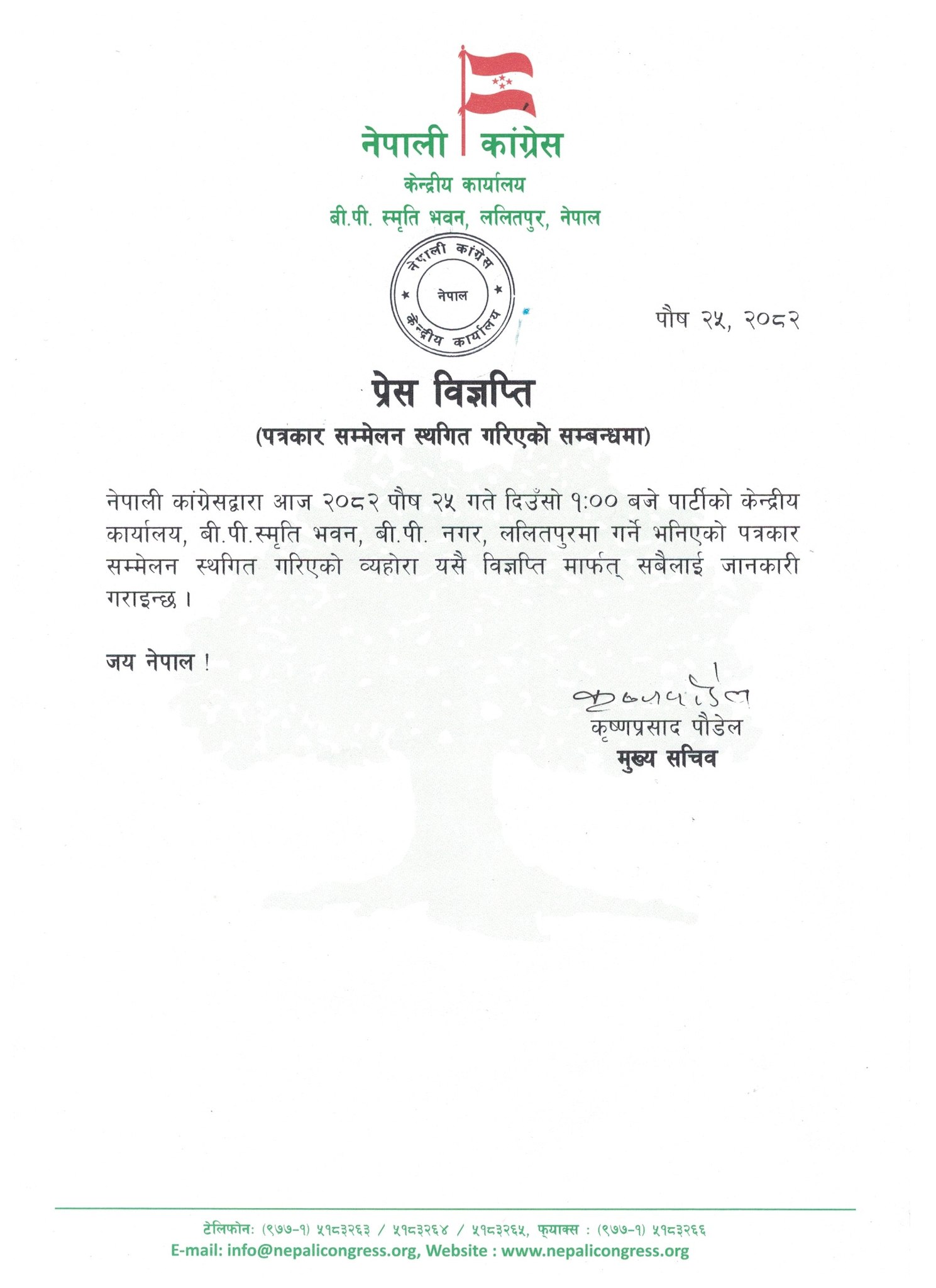 मुख्यसचिव कृष्णप्रसाद पौडेलले मध्याह्न पौने १२ बजे विज्ञप्ति निकालेर पत्रकार सम्मेलन स्थगित गरिएको जानकारी दिए।
