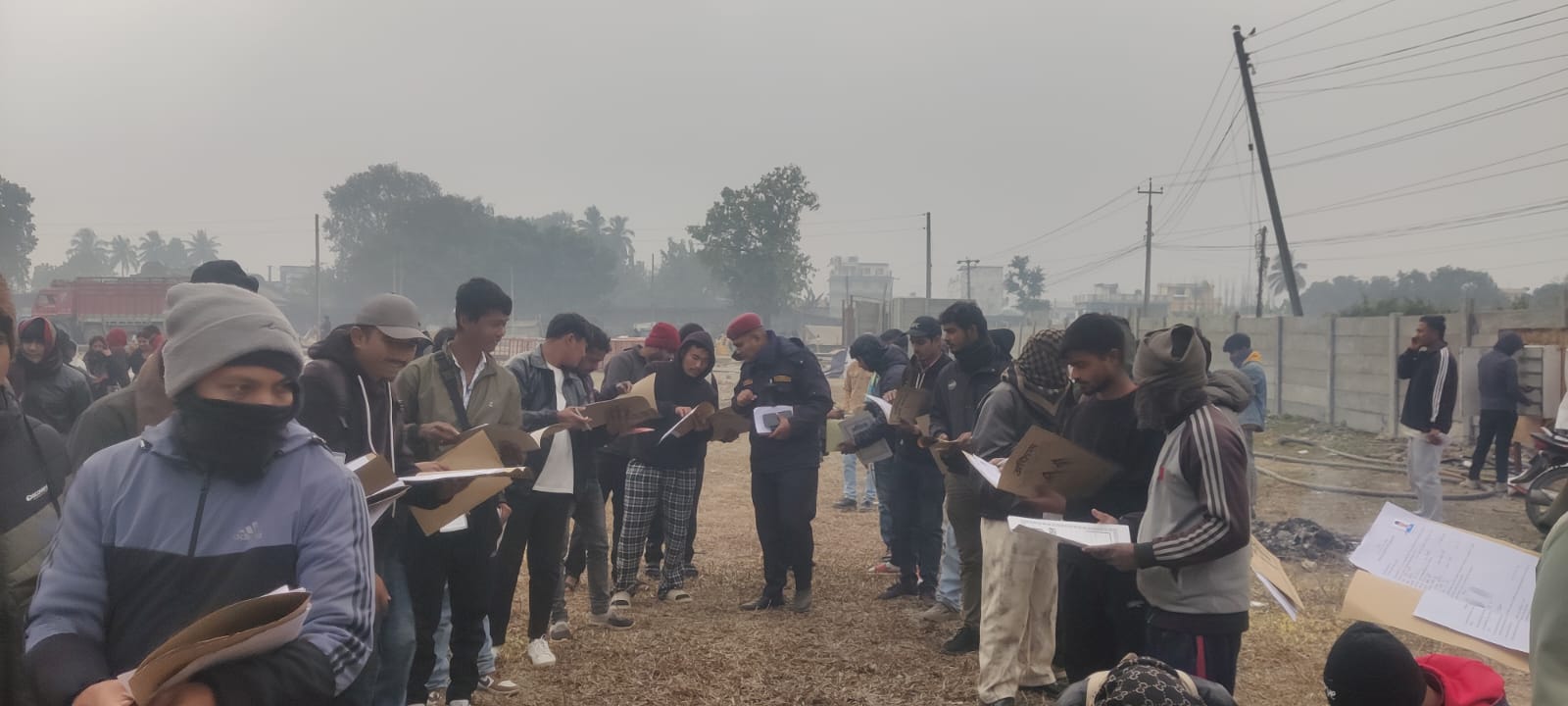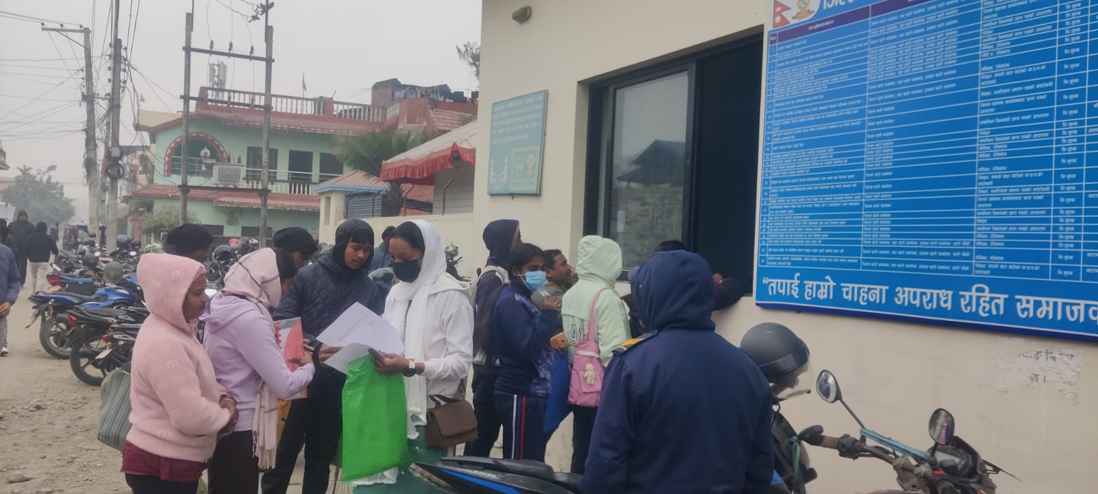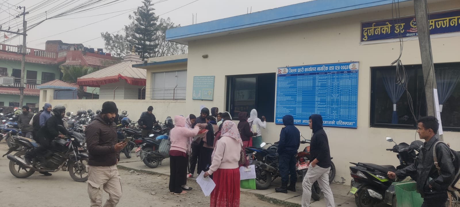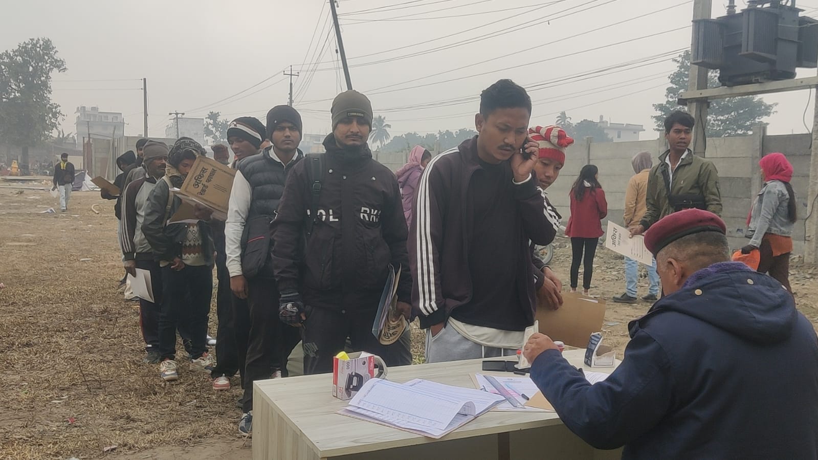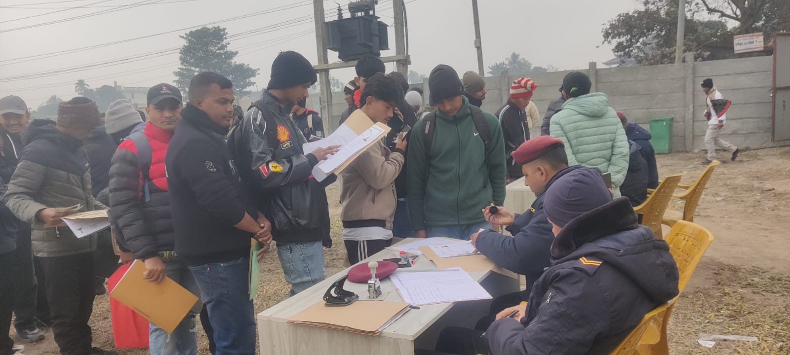 जिल्ला प्रहरी कार्यालयका इन्स्पेक्टर अभिषेककुमार श्रेष्ठको टोलीलाई आवेदन व्यवस्थित गर्न भ्याइनभ्याइ छ। १८ वर्ष पूरा भई ५४ वर्ष ननाघेका जोकोहीले पनि आवेदन दिन सक्ने व्यवस्थाले गर्दा भर्खरका युवादेखि अधबैंसेहरूसम्म लाममा भेटिन्छन्।