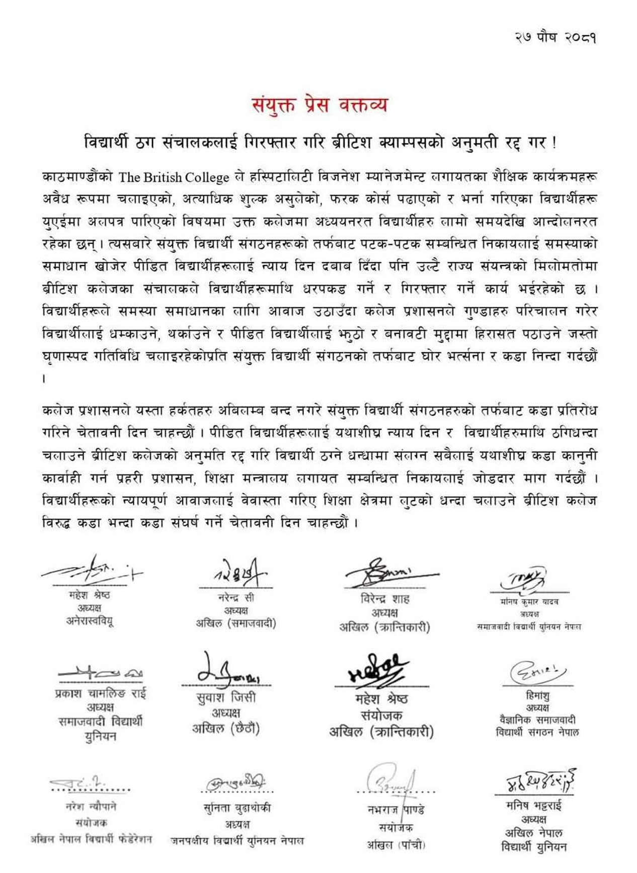 “पीडित विद्यार्थीहरूलाई यथाशीघ्र न्याय दिन र विद्यार्थीहरुमाथि ठगीधन्दा चलाउने ब्रिटिस कलेजको अनुमति रद्द गरी विद्यार्थी ठग्ने धन्धामा संलग्न सबैलाई यथाशीघ्र कडा कानुनी कारबाही गर्न प्रहरी प्रशासन‚ शिक्षा मन्त्रालयलगायत सम्बन्धित निकायलाई जोडदार माग गर्दछौँ‚” विज्ञप्तिमा उल्लेख छ।
