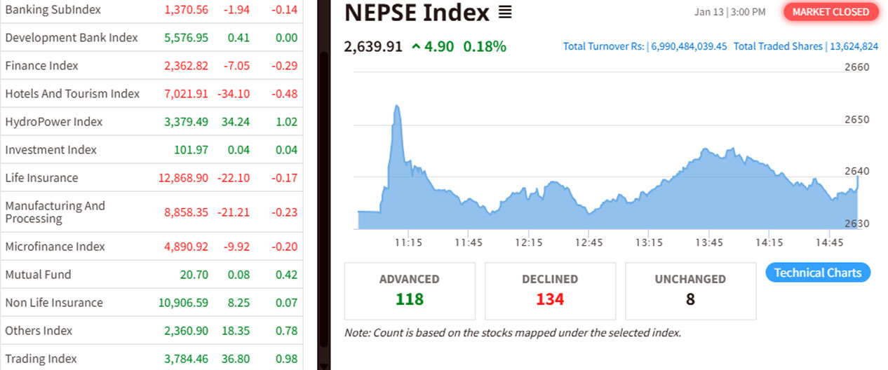 अघिल्लो दिनको तुलनामा ०.१८ प्रतिशतले बढेको नेप्से २६३९.९१ विन्दुमा पुगेको छ।