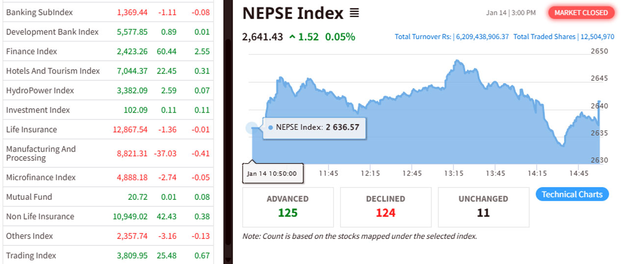 काठमाडौँ। नेपाल स्टक एक्सचेन्ज नेप्से आज (बुधबार) १.५२ अंकले बढेको छ। अघिल्लो दिनको तुलनामा ०.०५ प्रतिशतले बढेको नेप्से २‚६४१.४३ विन्दुमा अडिएको छ।