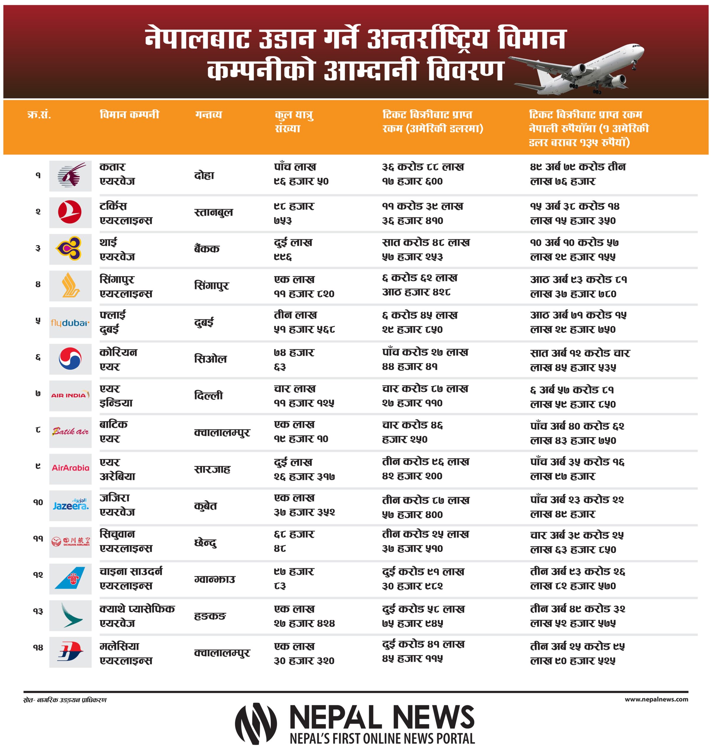 विदेशी एयरलाइन्सहरूले विभिन्न मुलुकबाट ल्याउने र नेपालबाट बाहिर जाने यात्रुलाई उडान सेवा दिएर डेढ खर्ब रुपैयाँभन्दा बढी रकम विदेश लगिरहेका छन्। उनीहरूले कार्गो सेवामार्फत गरेको आम्दानीको हिसाब यसमा समावेश छैन। कार्गो सेवाबाट गरेको आम्दानी जोड्दा नेपालमा सेवा दिने विदेशी एयरलाइन्सको आम्दानीको हिसाब अझ बढ्छ।