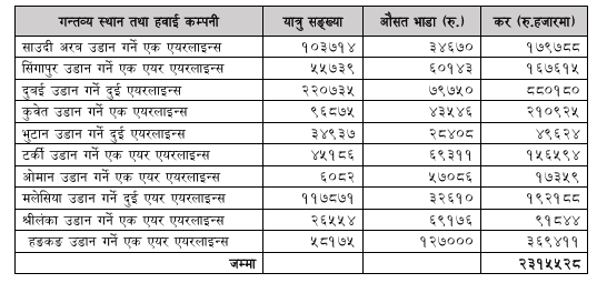 आव २०८०/८१ मा साउदी अरब, सिंगापुर, दुबई, कुबेत, टर्की, ओमान, श्रीलंका र हङकङ उडान गर्ने एक एक एयरलाइन्स, मलेसिया र भुटान उडान गर्ने दुई दुई एयरलाइन्सले कर नतिरेको महालेखापरीक्षकको प्रतिवेदनमा उल्लेख छ।
