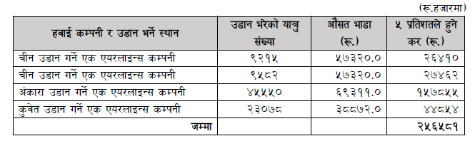 महालेखापरीक्षकको ६१औँ प्रतिवेदनमा चीनमा उडान गर्ने दुई एयरलाइन्स, अंकारा र कुबेत उडान गर्ने एक एक एयरलाइन्सले आव २०७९/८० मा २५ करोड ६५ लाख ८१ हजार रुपैयाँ कर, त्यसमा लाग्ने शुल्क र ब्याज नतिरेकाले छानबिन गर्नुपर्ने उल्लेख छ। यस्तै, आव २०८०/८१ मा १३ वटा विदेशी एयरलाइन्सले दुई अर्ब ३१ करोड ५५ लाख २८ हजार कर र त्यसमा लाग्ने शुल्क तथा ब्याज असुल गर्नुपर्ने प्रतिवेदनमा लेखिएको छ।