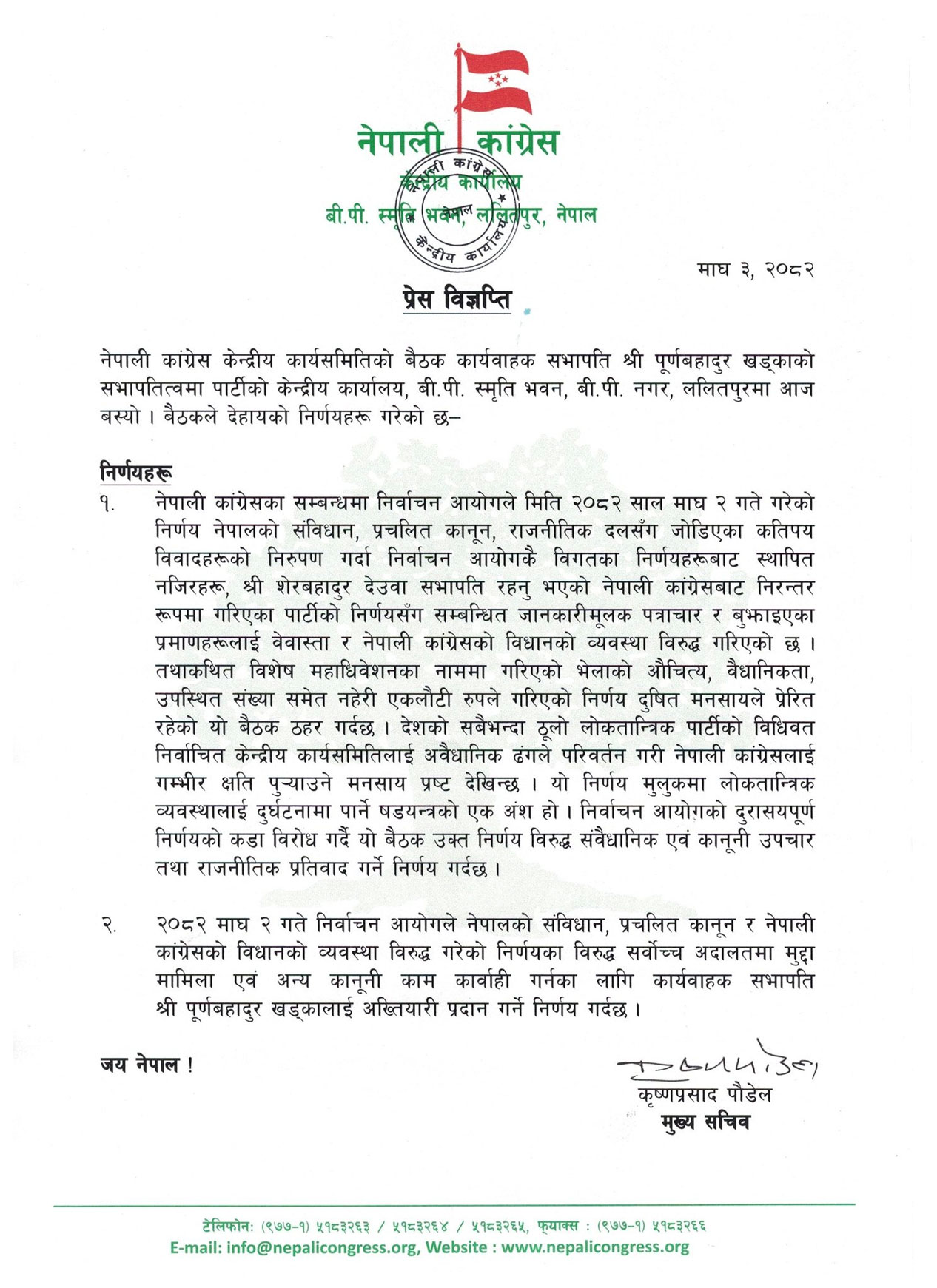 मुख्य सचिव कृष्णप्रसाद पौडेलद्वारा जारी विज्ञप्तिमा भनिएको छ‚ “निर्वाचन आयोगले गरेको निर्णयका विरुद्ध सर्वोच्च अदालतमा मुद्दा मामिला एवं अन्य कानुनी काम-कारबाही गर्नका लागि कार्यवाहक सभापति पूर्णबहादुर खड्कालाई अख्तियारी प्रदान गर्ने निर्णय गरिन्छ।”