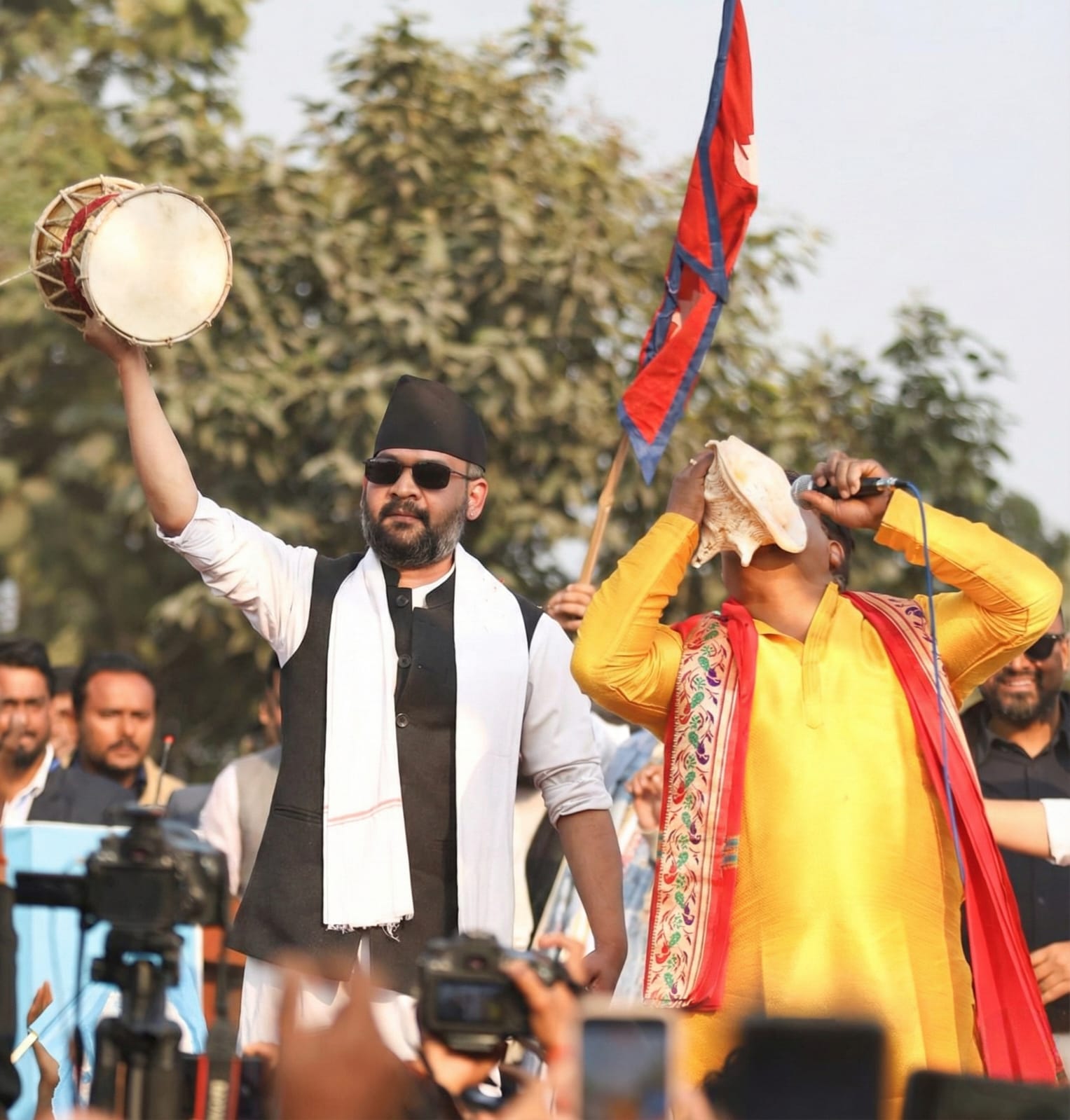 जनकपुरको तिरहुतिया गाछीमा आयोजित चुनावीसभाअघि शंखनाद गर्दै गर्दा डमरु बजाइरहेका बालेन। तस्बिर : बालेनको सचिवालय