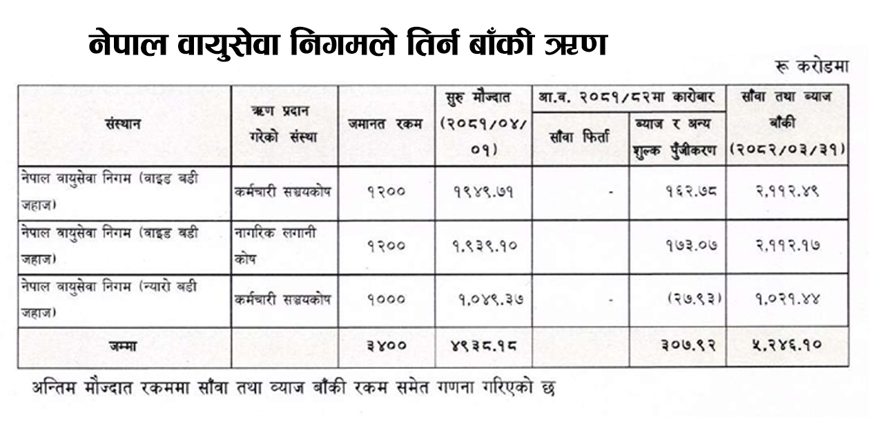 जहाजको अभावमा व्यापार गुमाएको निगम ऋणमाथि ऋणको बोझले थिचिन थाल्यो। २०७५ सालमा निगमले एयरबस कम्पनीका दुई वटा वाइडबडी जहाज किन्यो। त्यसअघि निगमले एयरबसकै दुई वटा न्यारोबडी जहाज भित्र्याइसकेको थियो। निगमले न्यारोबडी किन्न २०७० सालमा १० अर्ब ४९ करोड रुपैयाँ र वाइडबडी किन्ने बेला २०७४ सालमा २४ अर्ब रुपैयाँ ऋण लिएको थियो। उक्त ऋण लगानी सरकारको जमानीमा नागरिक लगानी कोष र कर्मचारी सञ्चय कोषले गरेका थिए। यो ऋणसहित निगमले तिर्नुपर्ने दायित्व सावाँ र ब्याज गरी सञ्चित ऋण ५२ अर्ब ४६ करोड रुपैयाँ पुगिसकेको छ। स्थापनाको ६८ वर्षमा निगम जोखिमको यात्रामा छ।