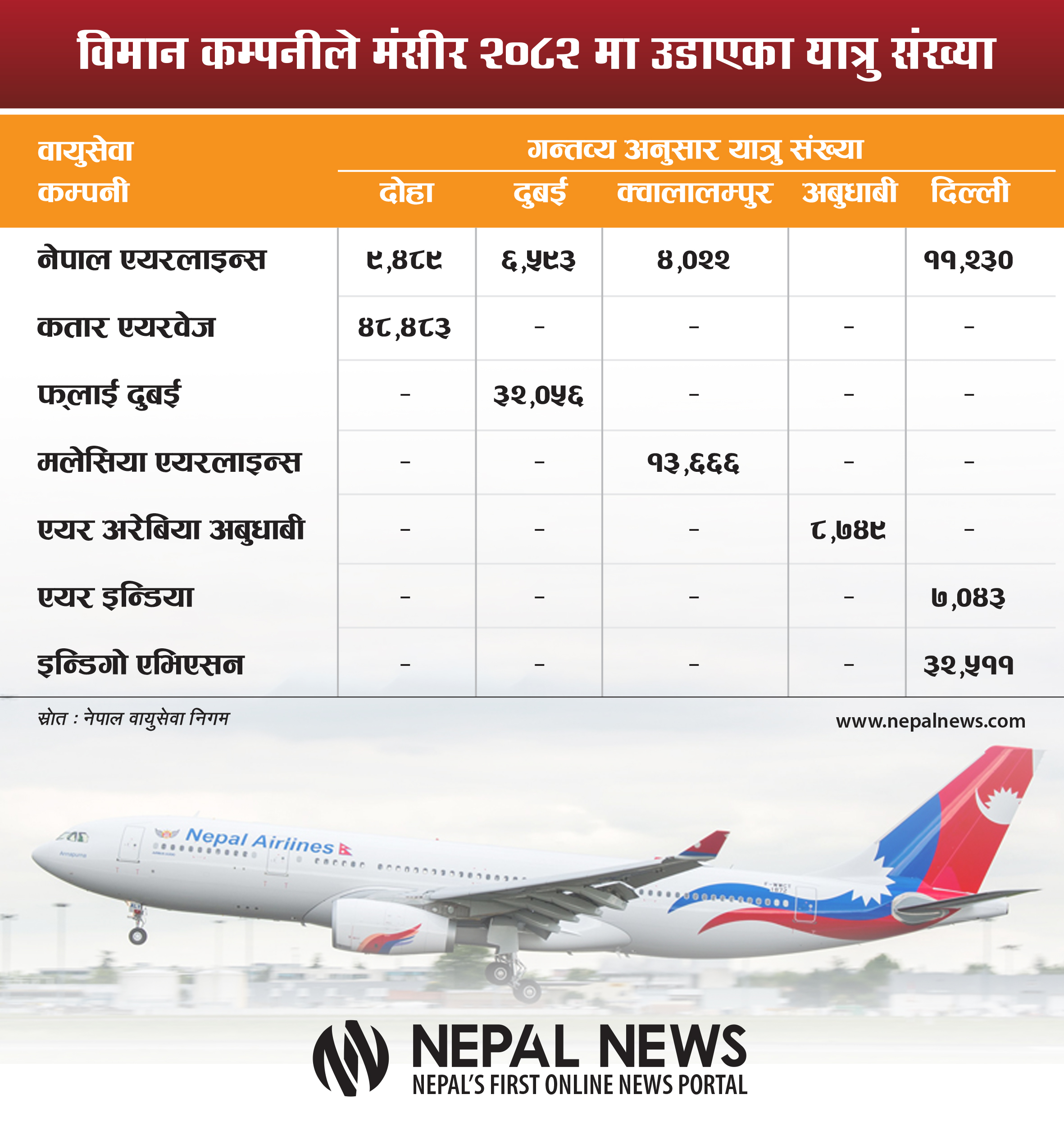 धेरै नेपाली वैदेशिक रोजगारमा जाने अर्को देश हो, युनाइटेड अरब इमिरेट्स (यूएई)। त्यहाँको प्रमुख सहर दुबईबाट काठमाडौँमा दुबई एभिएसन कर्पोरेसनको फ्लाई दुबई जहाजले हप्तामा सातै दिन उडान गर्दै आएको छ। नेपाल एयरलाइन्सले भने दुबईमा सातामा ६ वटा मात्रै उडान गर्छ। निगमले नै उपलब्ध गराएको तथ्यांकअनुसार गत मंसिरमा फ्लाई दुबईले ३२ हजार ५६ यात्रु बोक्दा नेपाल एयरलाइन्सले भने ६ हजार ५९३ जना मात्रै यात्रु बोकेको छ।