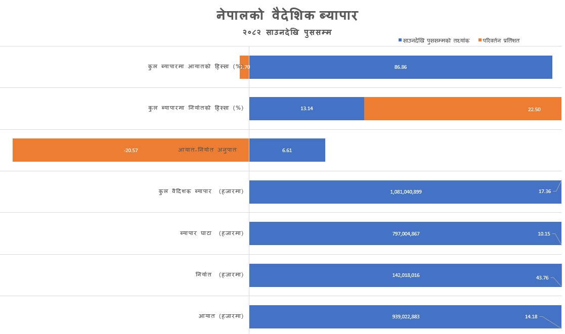 चालु आर्थिक वर्ष २०८२/८३ को ६ महिना (साउन-पुस)मा ११ खर्ब ८१ अर्ब चार करोड रुपैयाँको वैदेशिक व्यापार भएको छ। यस अवधिमा आयात १४.१८ र निर्यात ४३.७६ प्रतिशतले बढेको छ। कुल वैदेशिक व्यापार भने १७.३६ प्रतिशतले बढेको तथ्यांक छ।