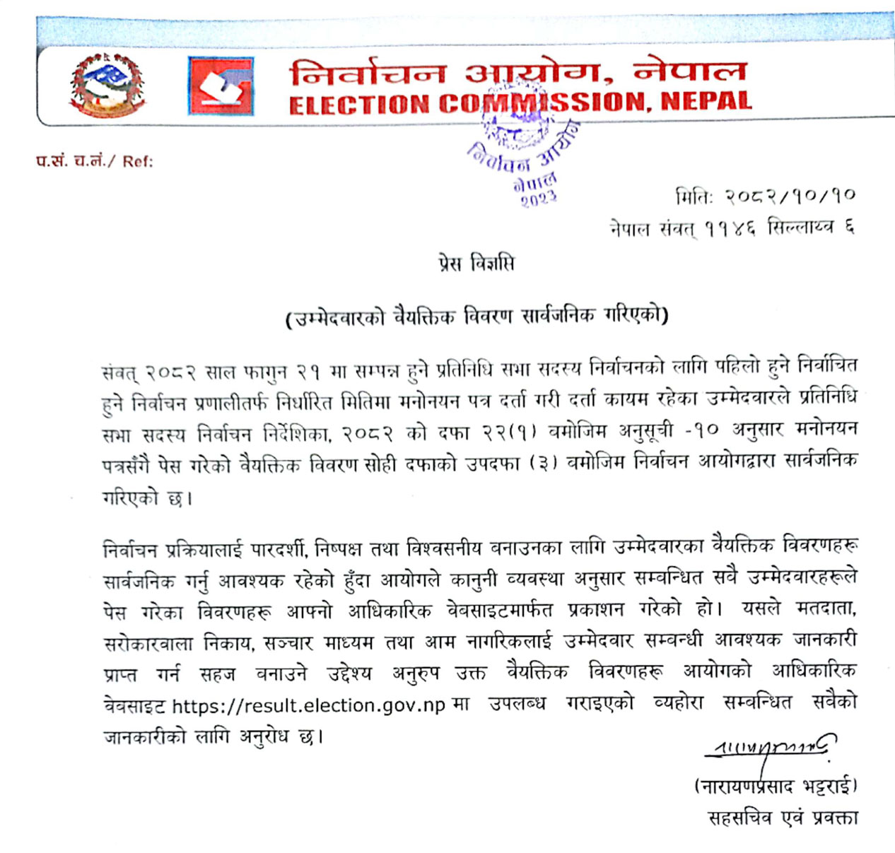 उम्मेदवारको वैयक्तिक विवरण आयोगको ‘वेबसाइट’ मा हेर्न सकिने पनि आयोगले जनाएको छ।