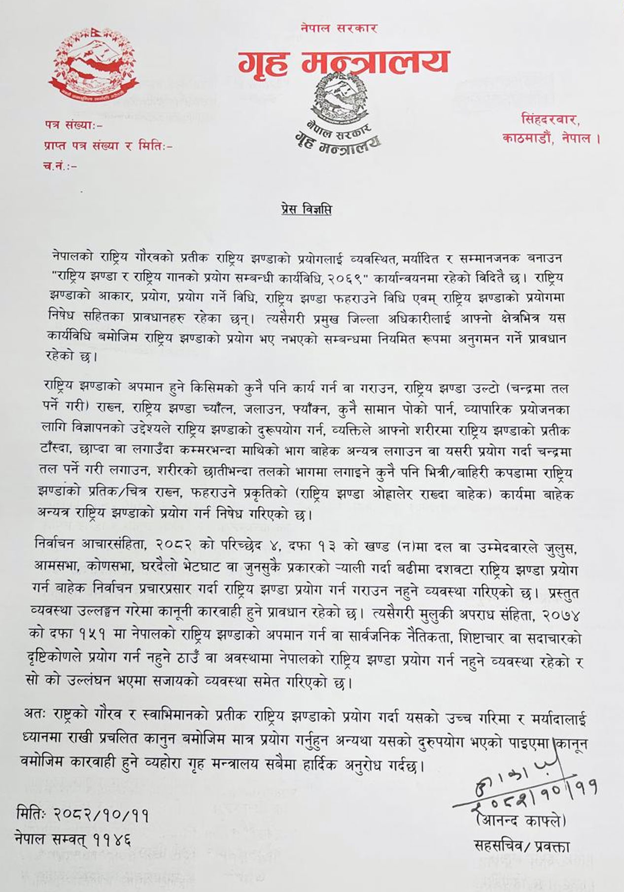 पार्टी तथा व्यक्तिले चुनाव तथा पार्टीका कार्यक्रमहरूमा राष्ट्रिय झन्डाको प्रयोग अत्यधिक गर्न थालेपछि मन्त्रालयले चेतावनी दिएको हो। गृह मन्त्रालयले आइतबार प्रेस विज्ञप्ति जारी गर्दै ‘राष्ट्रिय झन्डा तथा राष्ट्रिय गानको प्रयोगसम्बन्धी कार्यविधि, २०७९’ कार्यान्वयनमा रहेको उल्लेख गर्दै त्यसको उल्लङ्घन नगर्न आग्रह गरेको छ। राष्ट्रिय झन्डा राष्ट्रको गौरव र स्वाभिमानको प्रतीक भएकाले यसको प्रयोग मर्यादित, सम्मानजनक र कानुनी दायराभित्र हुनुपर्ने मन्त्रालयले जनाएको छ।