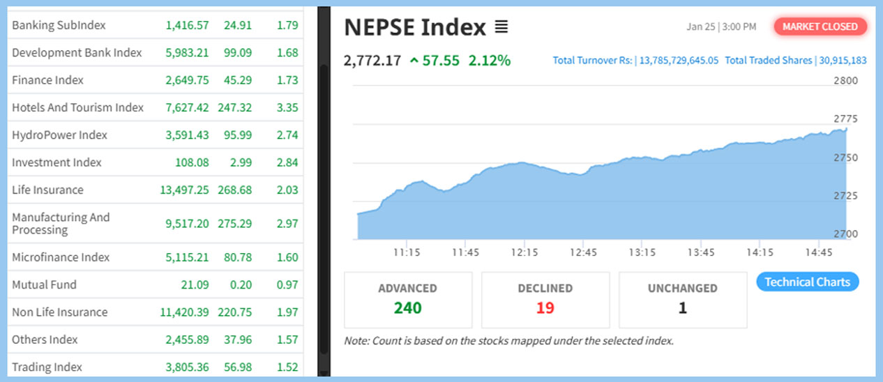५७.५५ अंकले बढेको नेप्से २‚७७२.१७ विन्दुमा रोकियो