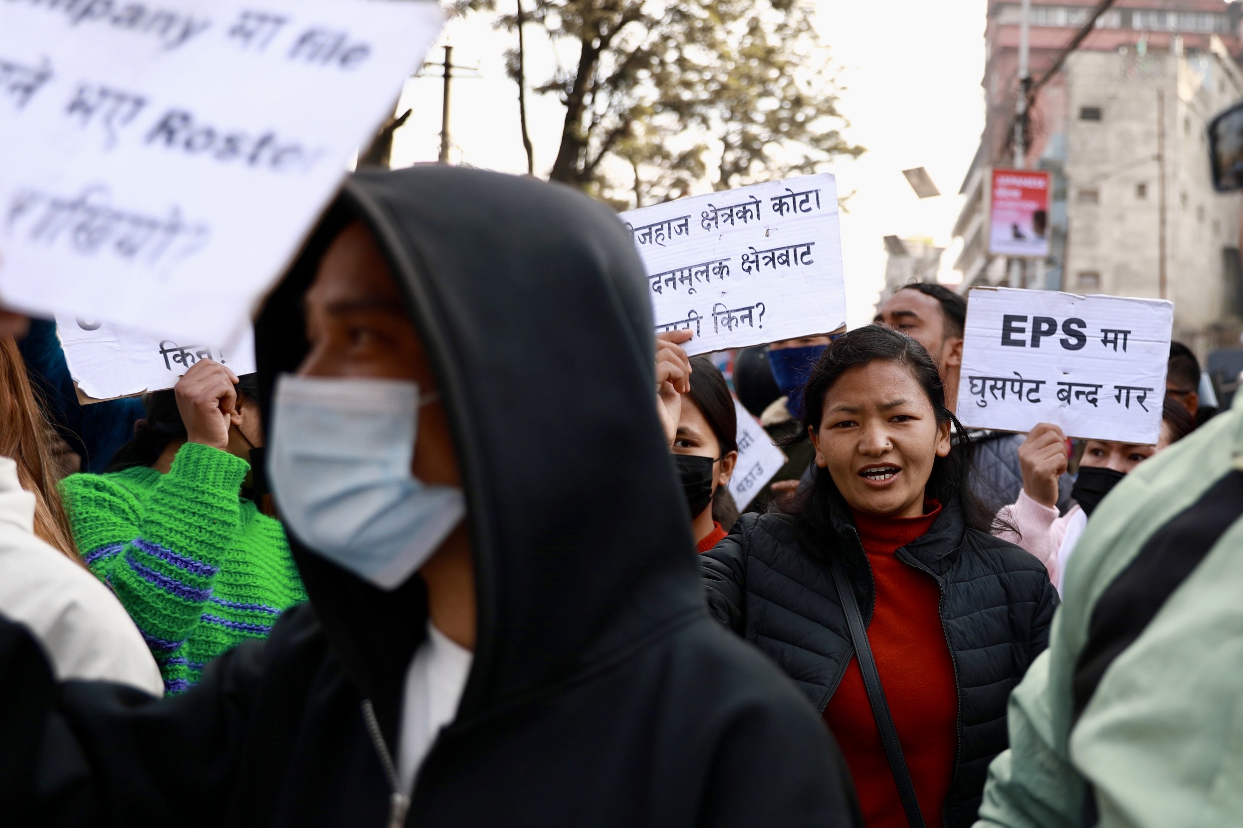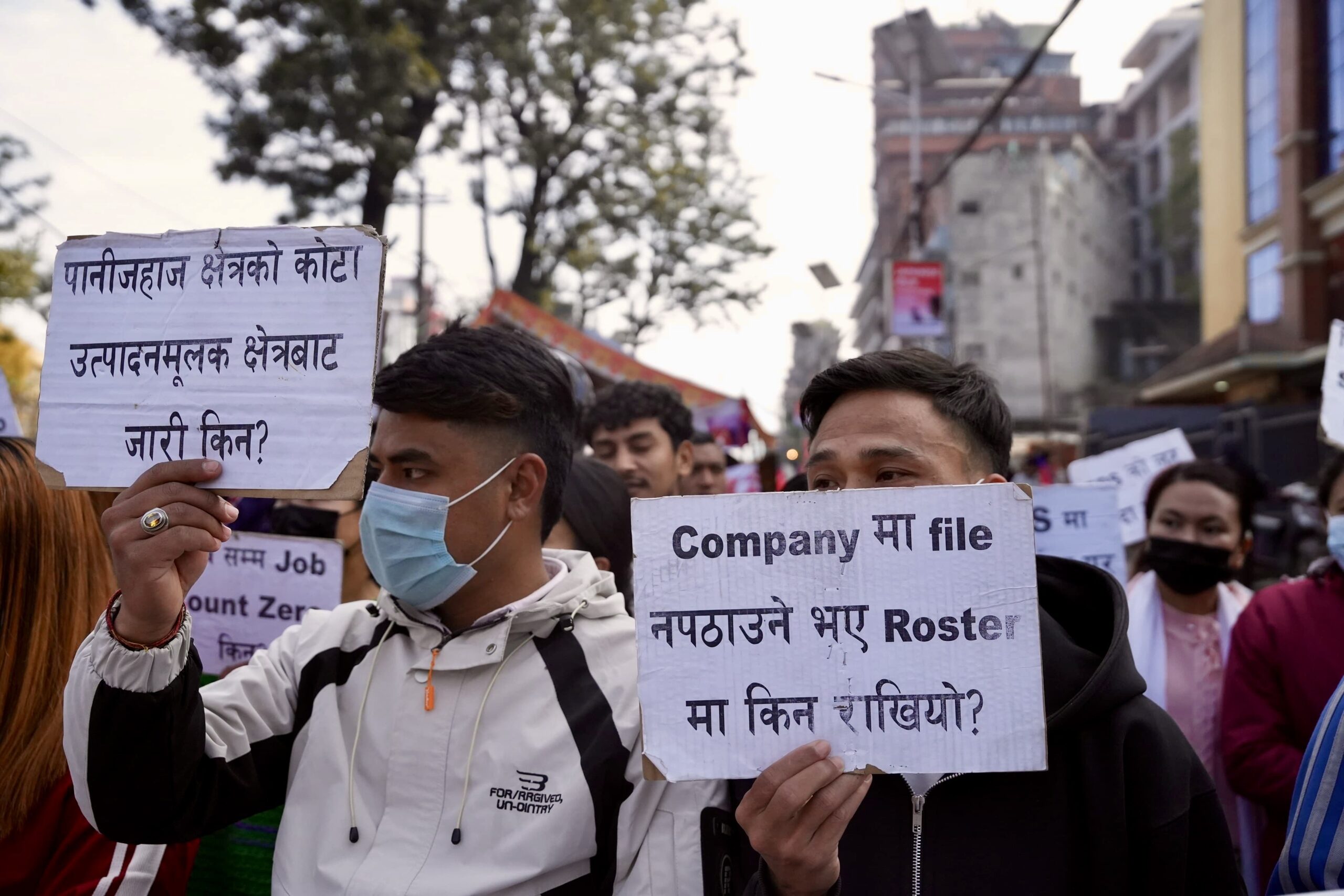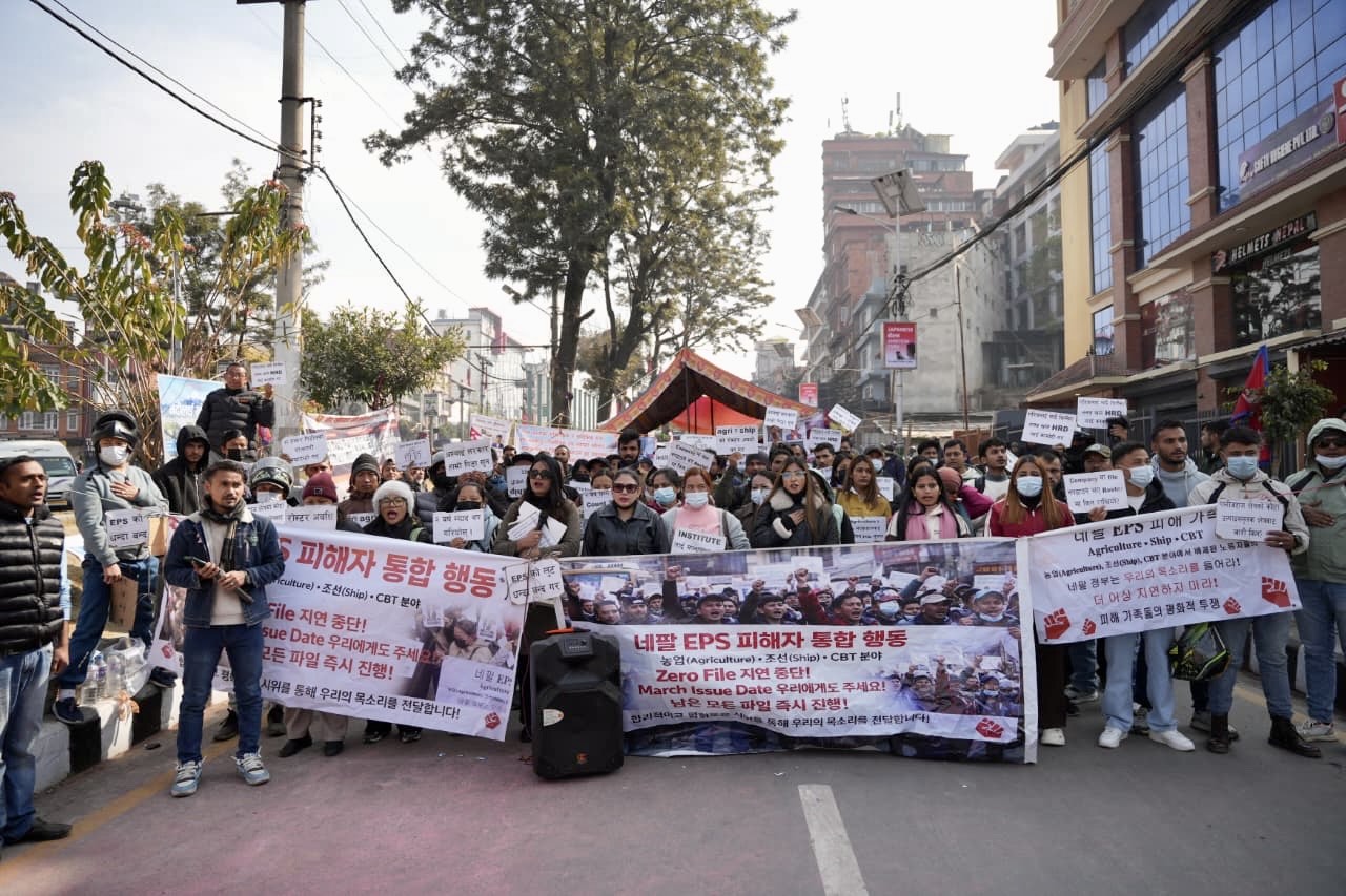 उनीहरूले प्लेकार्ड र ब्यानर बोकेर कोरिया जान पाउनुपर्छ भन्दै मंगलबार विरोध जनाए।