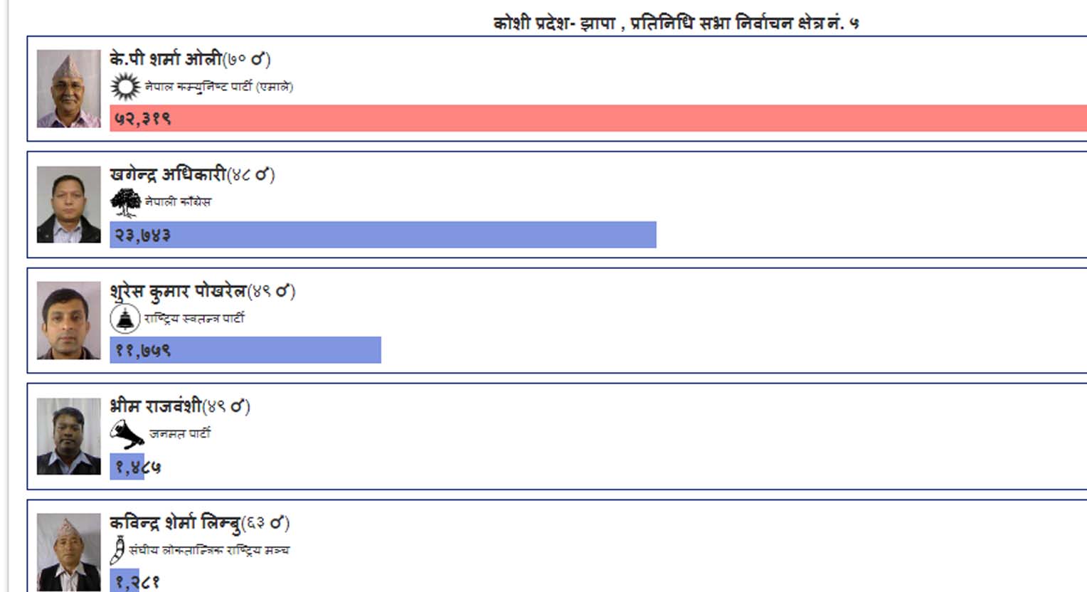 हुन पनि झापा ५ यस्तो चुनावी मैदान बनेको छ, जसको नतिजा सार्वजनिक हुनेबित्तिकै प्रधानमन्त्रीका दुई दाबेदारमध्ये एक जना बाहिरिनेछन्। त्यसैले झापा ५ मा हुने निर्वाचनलाई दुवै उम्मेदवारले प्रतिष्ठाको लडाइँ बनाएका छन्। झापा ५ मा चार वटा पालिका पर्दछन्। कमल गाउँपालिकाका सात, गौरादह नगरपालिकाका आठ, गौरीगन्ज गाउँपालिकाका चार र दमक नगरपालिकाका १० वटा वडा यस क्षेत्रमा पर्दछन्। यहाँ एक लाख ६३ हजार ३७९ जना कुल मतदाता छन्। यसपालि नौ हजार ९० नयाँ मतदाता थपिएका छन्।