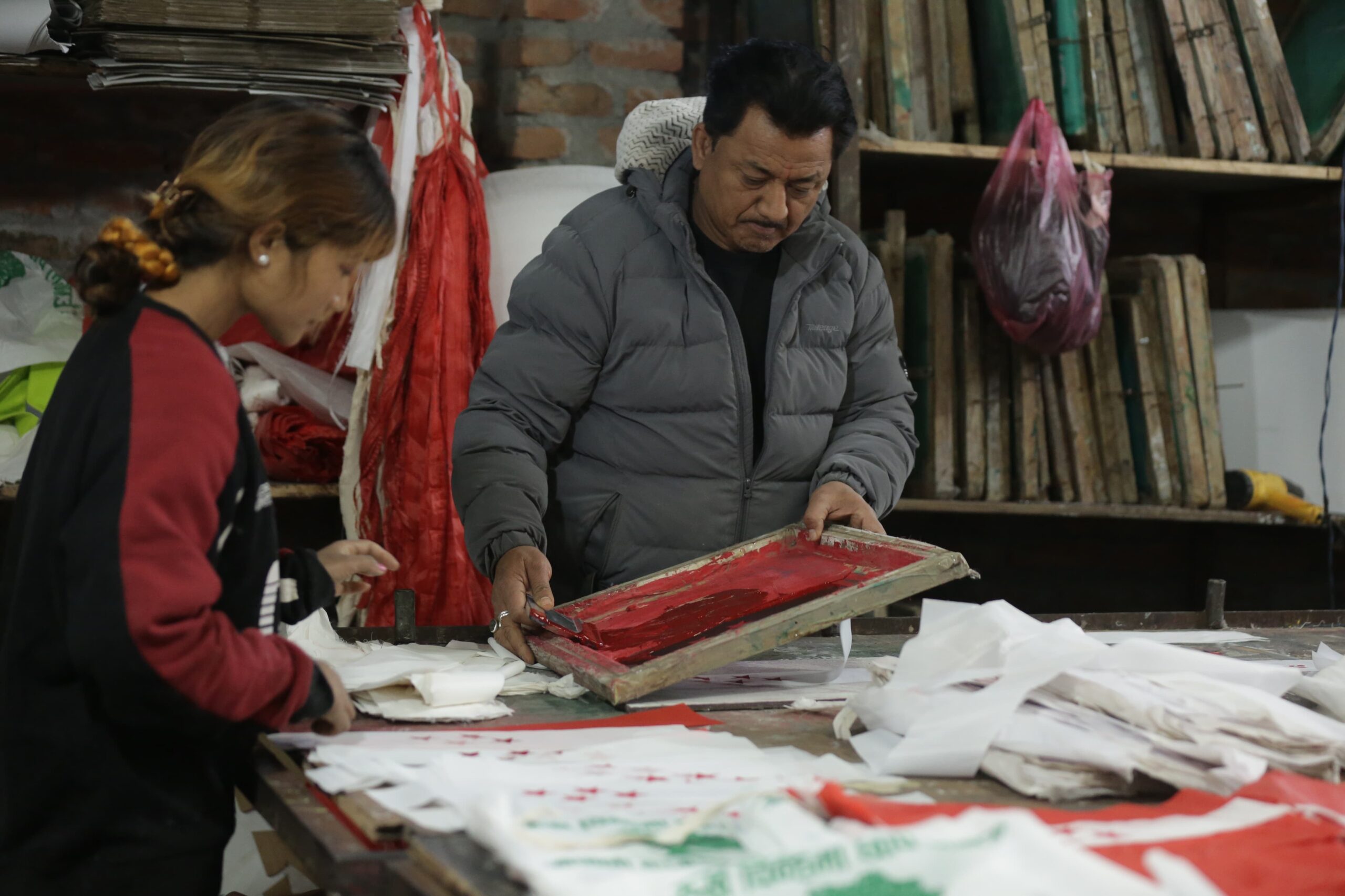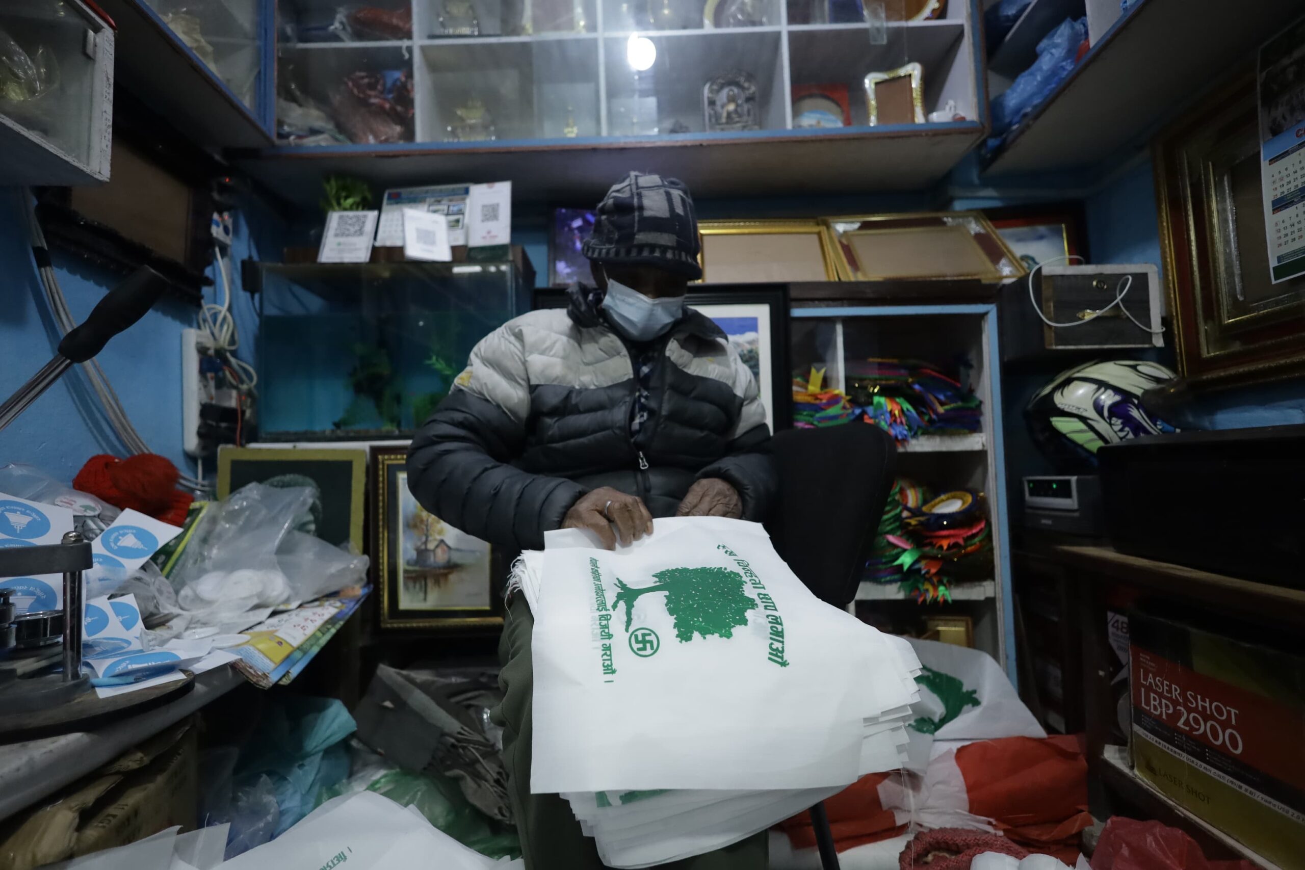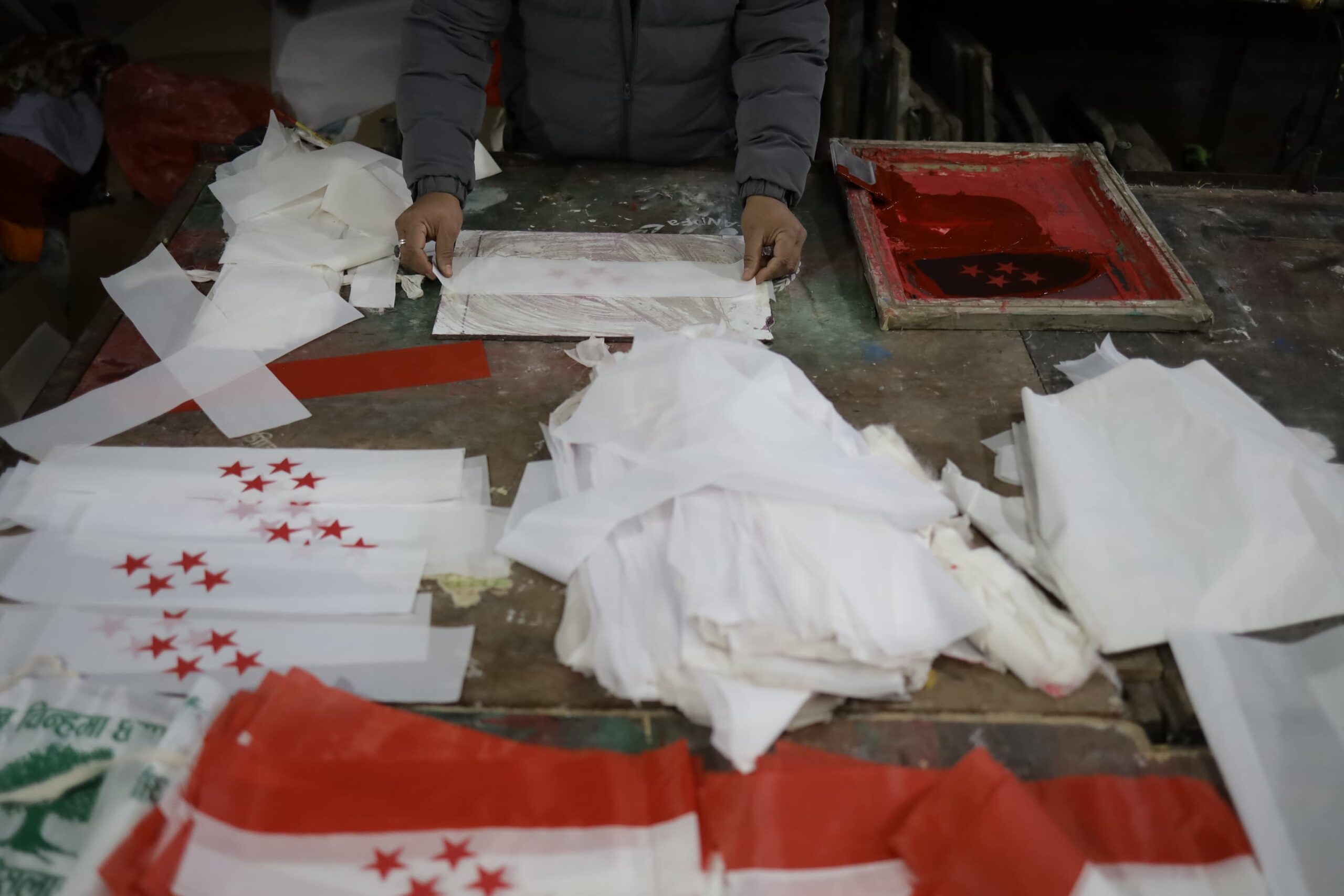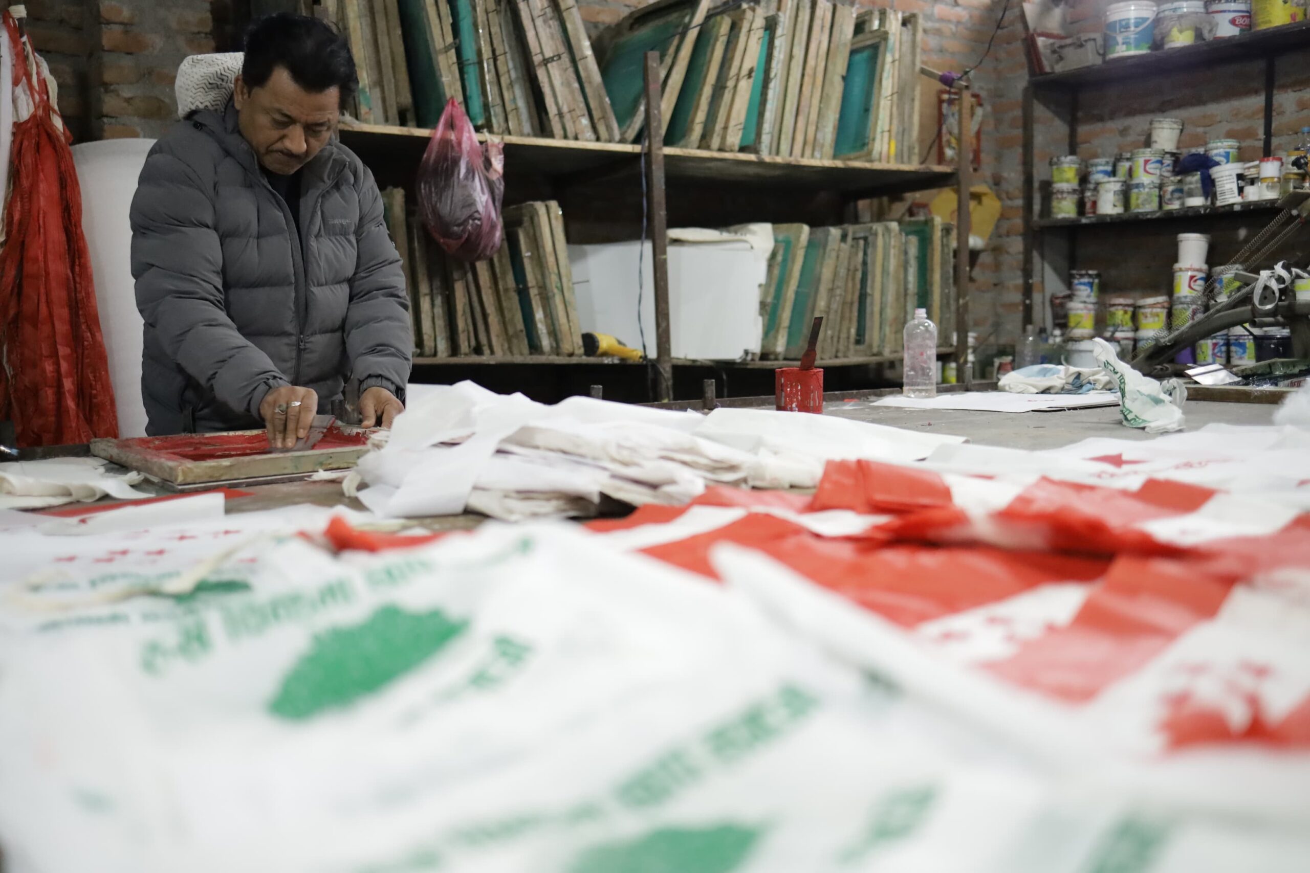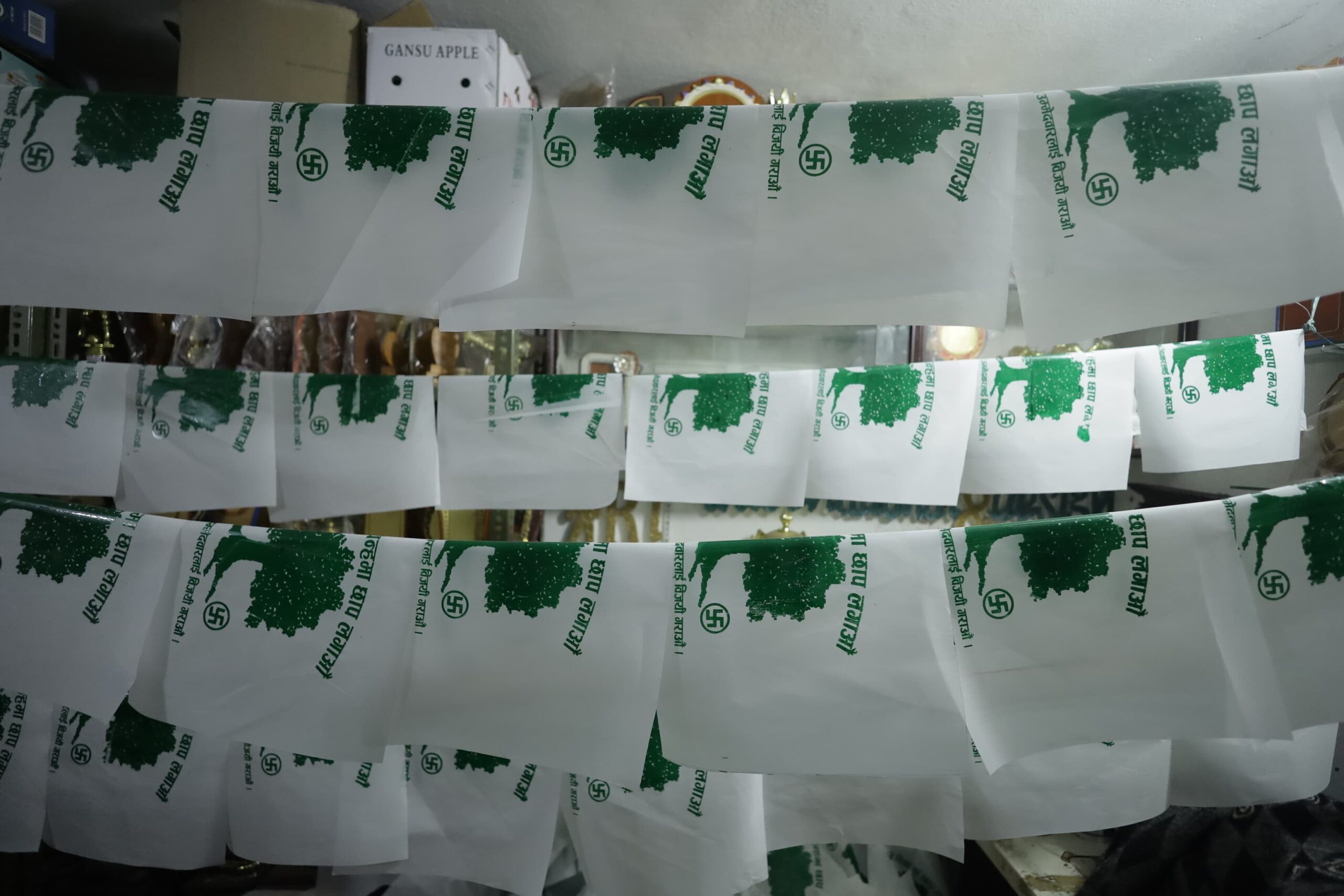 निर्वाचन प्रचारमा दलका झन्डा र प्रचार सामग्री प्रयोगमा निर्वाचन आयोगले कडाइ गरेका कारण अर्डर कम आएको हुन सक्ने व्यवसायीहरूको अनुमान छ। हेर्नुहोस् नेपाल फोटो लाइब्रेरीले खिचेका प्रचार सामग्रीका थप तस्बिर :