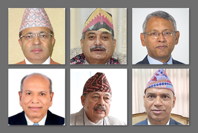 नेपाल फर्किएर राजीनामा गरेका राजदूतहरू लोकदर्शन रेग्मी, कृष्णप्रसाद ओली, चन्द्रप्रकाश घिमिरे, रमेशचन्द्र पौडेल, जंगबहादुर चौहान र नेत्रप्रसाद तिमल्सिना।