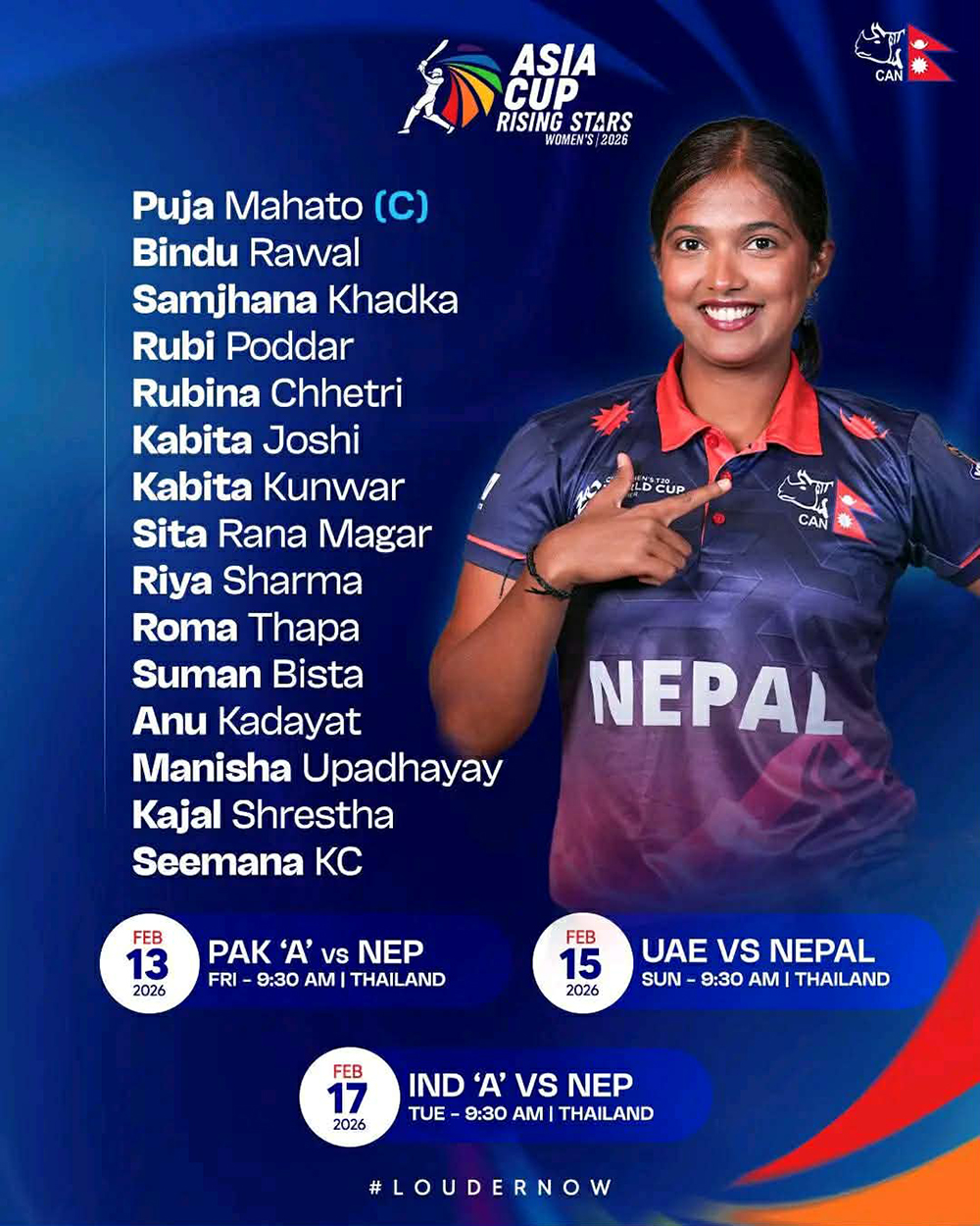 नेपाल क्रिकेट संघ (क्यान)ले पूजाको कप्तानीमा एसिया कप खेल्ने टोली घोषणा गरेको हो । कप्तान इन्दु बर्मा घाइते भएका कारण उपकप्तान पूजालाई कप्तानको जिम्मेवारी दिइएको हो ।