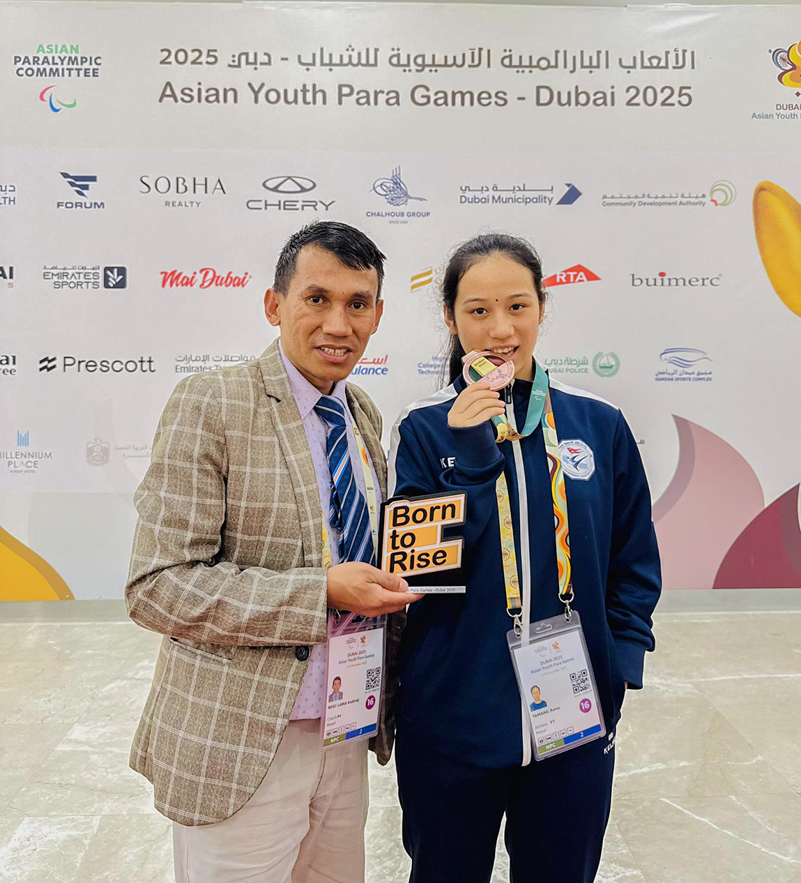 एसियाली युवा पारा खेलकुद – दुबईमा कांस्य पदक जितेपछि प्रशिक्षक कविराज नेगी लामासँग रेणु तामाङ। तस्विरः कविराज नेगी लामा