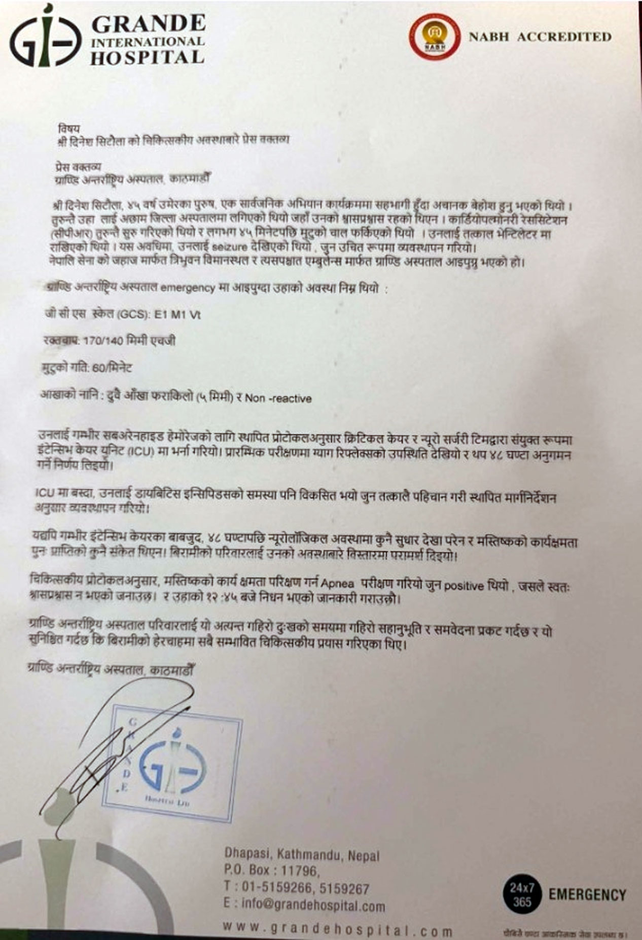ग्रान्डी अस्पतालको भेन्टिलेटरमा राखेर उनको उपचारकै क्रममा निधन भएको चिकित्सकले जनाएका छन्।