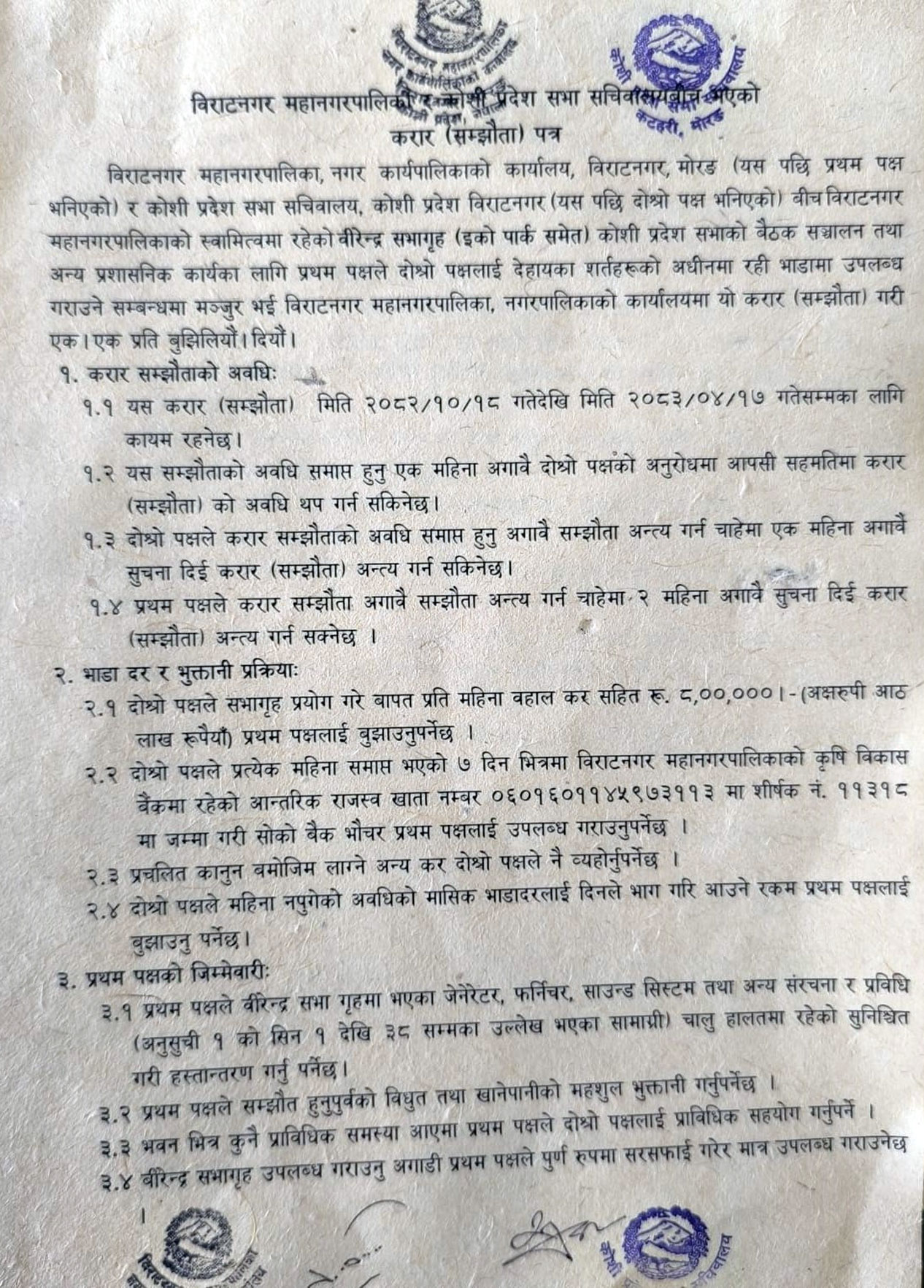 वीरेन्द्र सभा गृह हल भाडामा लगाउने विषयमा महानगरपालिका र प्रदेश सभा सचिवालयबीच भएको सम्झौता पत्रको विवरण।
