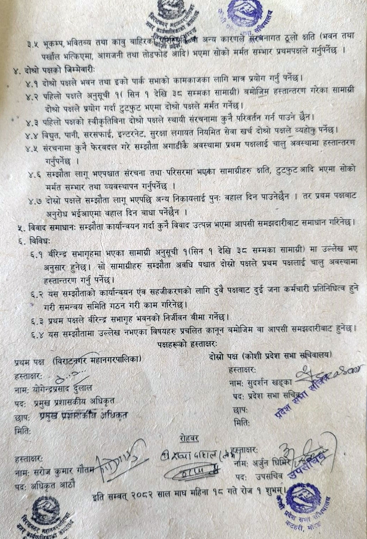 सम्झौतापत्रमा प्रदेशसभा सचिवालयका तर्फबाट सचिव सुदर्शन खड्का र महानगरपालिकाका तर्फबाट प्रमुख प्रशासकीय अधिकृत योगेन्द्रप्रसाद दुलालले हस्ताक्षर गरेका छन्। रोहबरमा महानगरका अधिकृत सरोजकुमार गौतम र प्रदेशसभाका उपसचिव अर्जुन घिमिरेले हस्ताक्षर गरे।